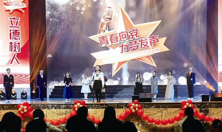 12月16日,常德市中学生校园主持人大赛在常德芷兰实验学校举行。从市城区10所学校脱颖而出的10名选手同台PK,奏响“青春向党 为梦发声”最强音。图为参赛选手登台亮相。 尚一网记者 李龙 摄