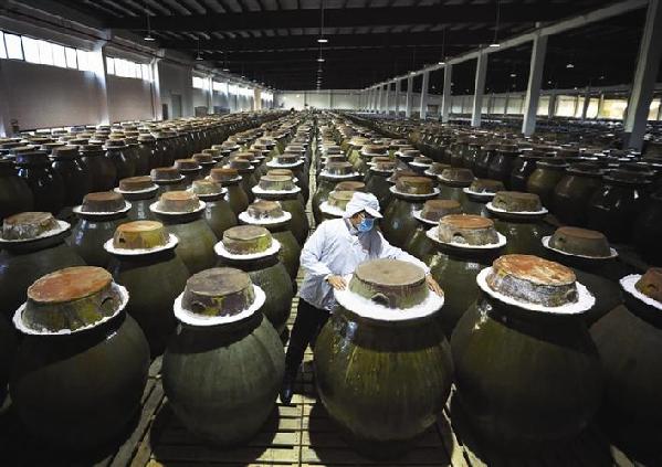 12月20日,工人将腌制的酱菜放入千斤老陶坛进行盐封。湖南津山口福食品有限公司已进驻桃源县高新技术产业园,力争打造年加工能力10万吨、产值5亿元的蔬菜行业旗舰品牌。该公司现有蔬菜种植基地1万亩、千斤老陶坛3万余个,产品远销日本、韩国,其中老坛酸菜被多家知名餐饮连锁企业选定为指定商品。尚一网记者 刘颂 通讯员 郭婧/摄