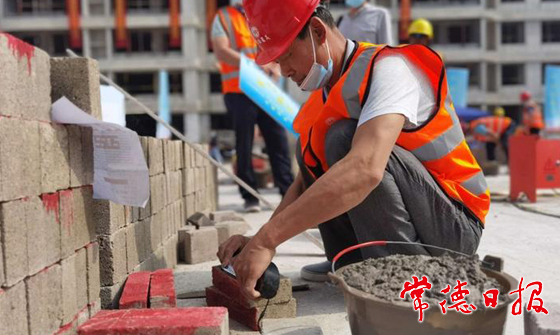 4月27日,劳动最美——2022年常德市武陵区“喜迎二十大 建功新时代”劳动技能竞赛启动仪式暨砌筑工竞赛,在常德旭辉国际新城建筑工地举行。来自武陵区的环卫保洁员、砌筑工、叉车工等8个工种的70名选手参加启动仪式,50名砌筑工选手进行了技能切磋。此次劳动技能竞赛将持续到8月份。图为比赛现场。 记者 武大为 通讯员 郭海龙 摄
