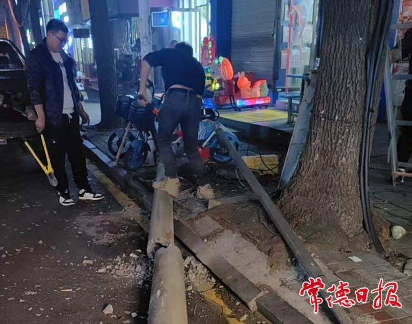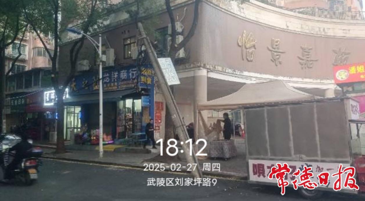 常德日报记者 伍银 曾妮 通讯员 胡芳勤 文/图 近日,“全民城管”平台收到市民上报称:湖南省常德市武陵区刘家坪路怡景嘉苑附近有一处电线杆严重倾斜,底部地面翘起,存在严重安全隐患。3月1日20时20分许,在多方协同处置下,该电线杆被成功拆除。