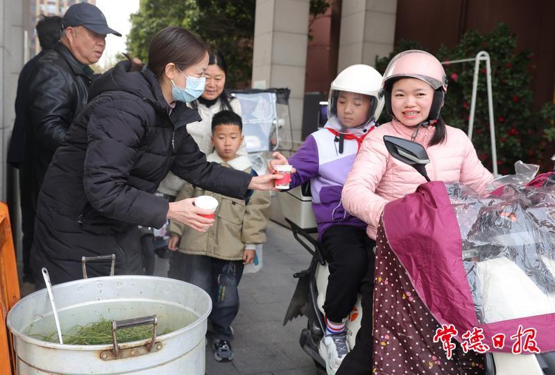 常德日报记者 徐珊珊 文/图 3月31日正值农历三月初三,市城区富新·瞰江南小区物业工作人员提前一天做好地米菜(荠菜)煮鸡蛋,一大早在小区门口分发给业主,获得业主点赞。