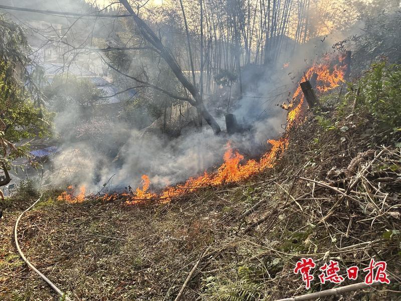 山上黑烟滚滚,外围站满了围观群众,严重阻碍救援车辆部署。肖方淼迅速分工,让驻村干部负责疏散无关人员,自己则上山了解火情。山上道路狭窄拥堵,首批农村消防员已手脚并用冲向火线。火势凶猛,西侧被烧焦的树干冒着黑烟、发出爆裂声,北侧紧邻高速公路,一旦火势蔓延,后果不堪设想。肖方淼当机立断,决定采用逆风围堵灭火策略,控制火势往南侧蔓延。