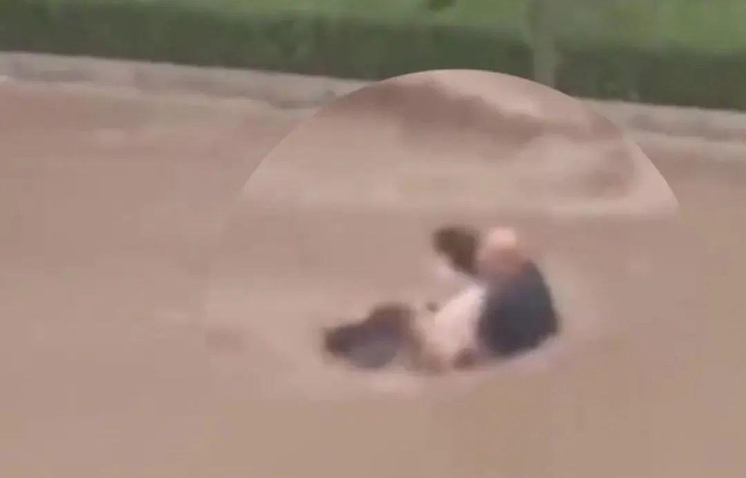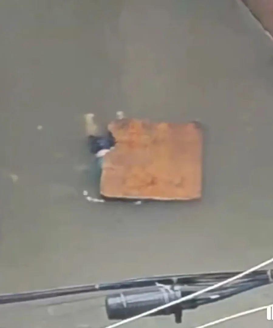 据目击者拍摄的视频,路面积水没过了他们的座椅,电动车随时有打滑翻车、进水漏电、电池短路的可能,二人曾伸手试图扒住一辆客车车尾自救,结果直接被急流卷入车底。