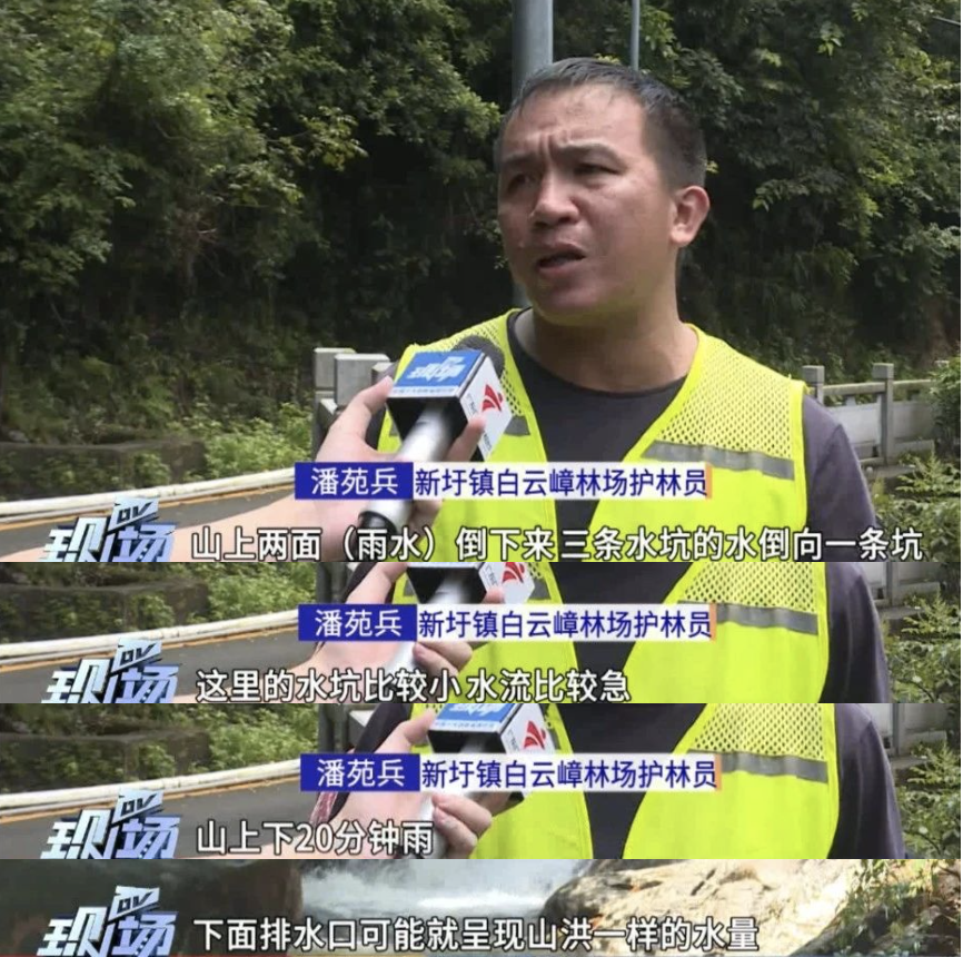 据广东广播电视台报道,当地新圩镇白云嶂林场护林员潘苑兵告诉记者:“那个时候还是毛毛雨的时候,他们躲在桥洞下面换衣服,中午十二点多就突然狂风暴雨。”