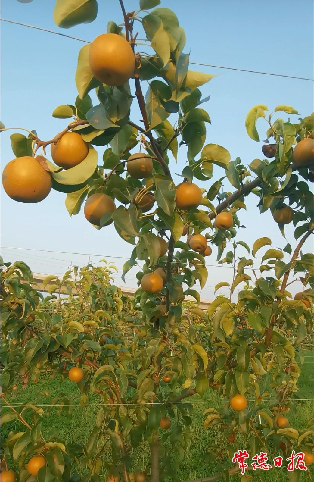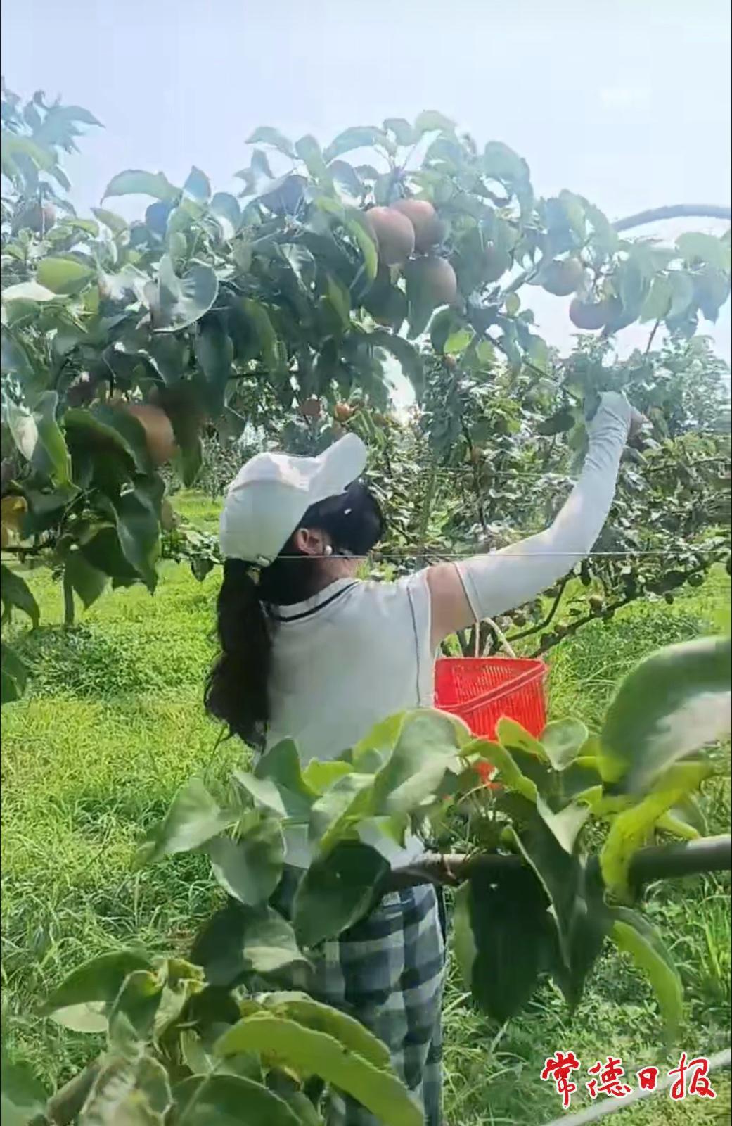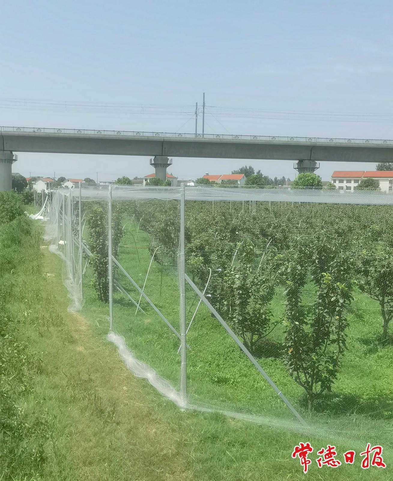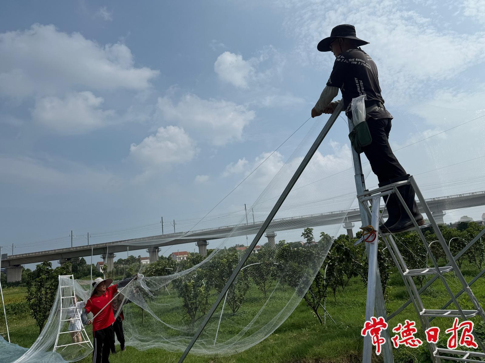 7月暑气蒸腾,在武陵区芦荻山乡金狮堤社区七组的果长德家庭农场,16亩梨园里的圆黄梨正挂满枝头,黄澄澄的果实散发着诱人果香。农场负责人李平进却无暇感受丰收的喜悦,他正和工友们顶着烈日,在3米多高的空中拉设防鸟网——这是他为守护果实筑起的最后一道防线。