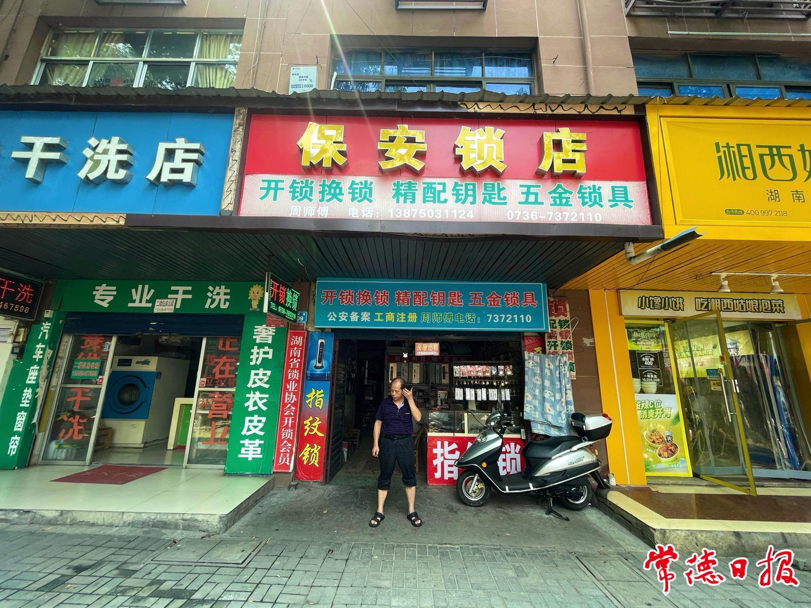 锁店店主周立峰是鼎城区黄土店镇人,1963年出生。这家保安锁店很有名气,周立峰经常接到从乡镇打来的开锁换锁买锁的电话。小店的收入,也撑起了一家人的生活,两个儿子读书成家全靠它。“从去年10月开始,店里的生意差了一些,但是影响不太大。”周立峰一边和我们闲聊,一边将空了的名片盒放满。需要紧急开锁的情况,虽然一辈子也遇不上几次,但遇到了也挺麻烦,从保安锁店门前经过的行人,看到开锁字样停下来取张名片的就不少。