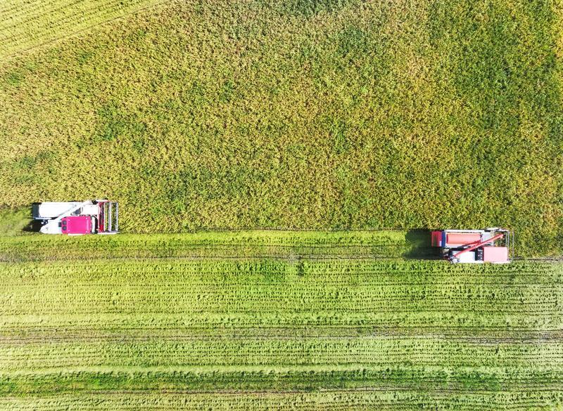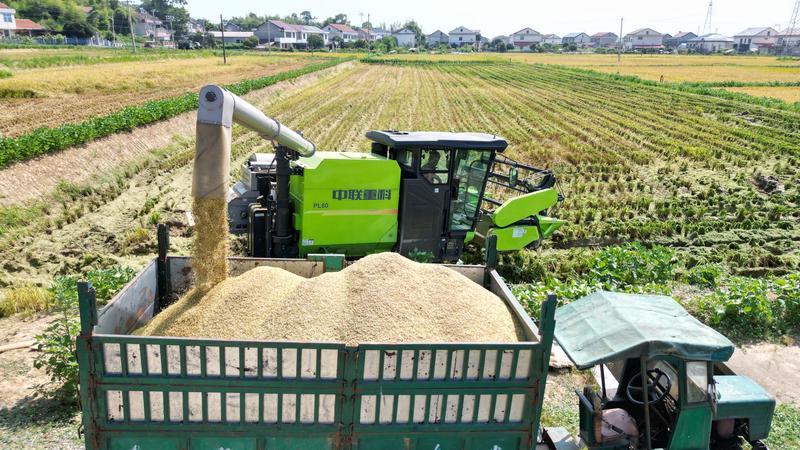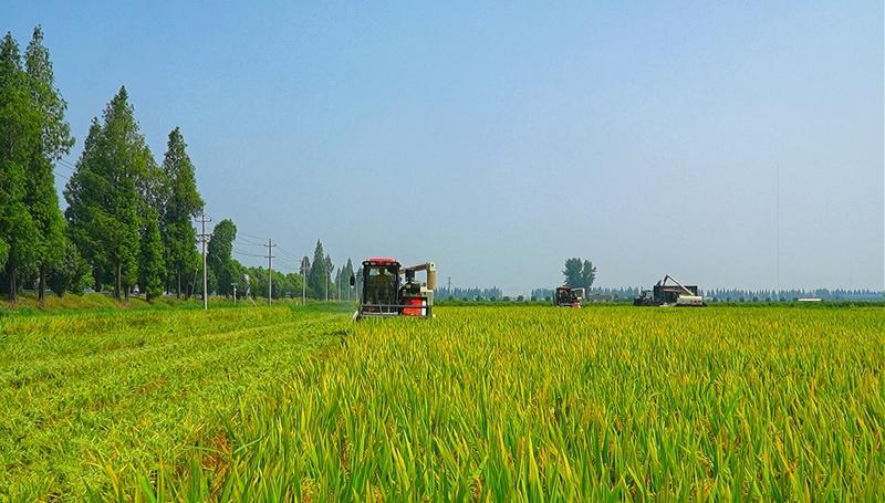 收割机的轰鸣声惊起了白鹭,它们从安乡县盛鑫农作物种植专业合作社联合社育秧及种植基地万亩稻田中振翅起飞;青黄相接的田畴上,“钢铁巨兽”吞吐着稻穗,几分钟便卸下一车车饱满的谷粒……粉碎的秸秆扬起一片金色尘雾,又悄然还田,化作下一季的绿意。