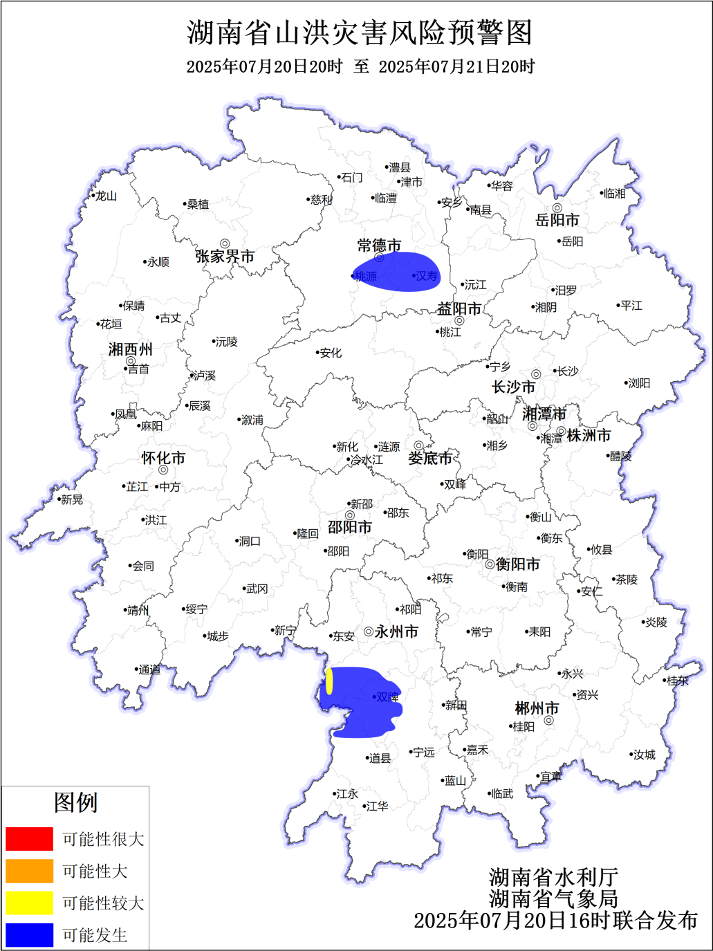 根据省气象局7月20日预报,省水利厅与省气象局联合会商得出如下结论:受降雨影响,20日20:00至21日20:00,永州市、常德市等局地可能发生山洪灾害。