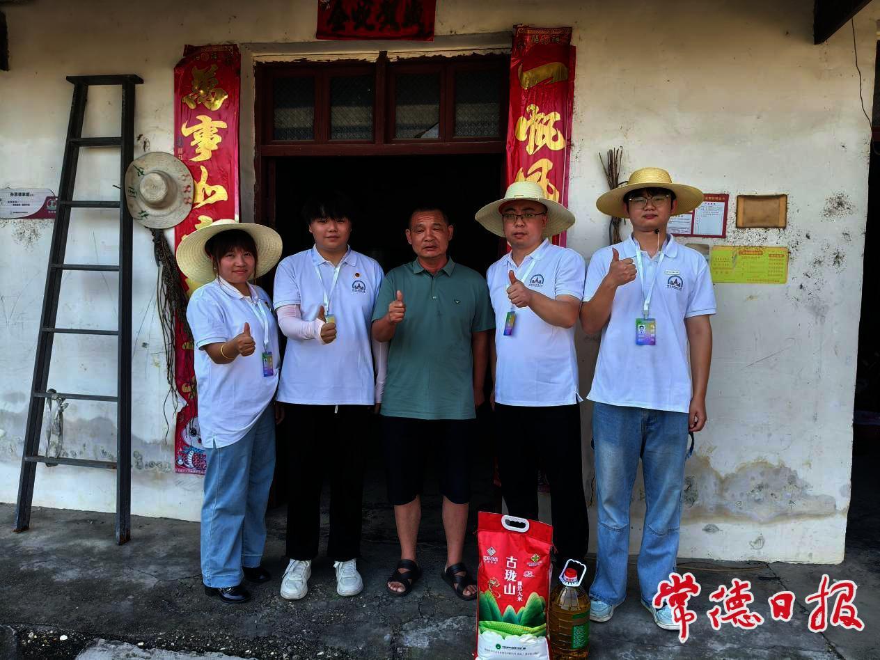 常德日报记者 张渝婧 通讯员 王海峰 邹红菊 杨峻 文/图 7月6日清晨,湖南应用技术学院“筑梦同心”社会实践团的队员拎着沉甸甸的米袋、油桶,沿着蜿蜒的村道走进了鼎城区谢家铺镇港中坪村,敲响了孙忠强老人的家门。当队员们将生活物资轻轻放下时,老人布满皱纹的脸上绽开了笑容,这份带着青春温度的关怀,悄悄融化老人独居生活的孤寂。