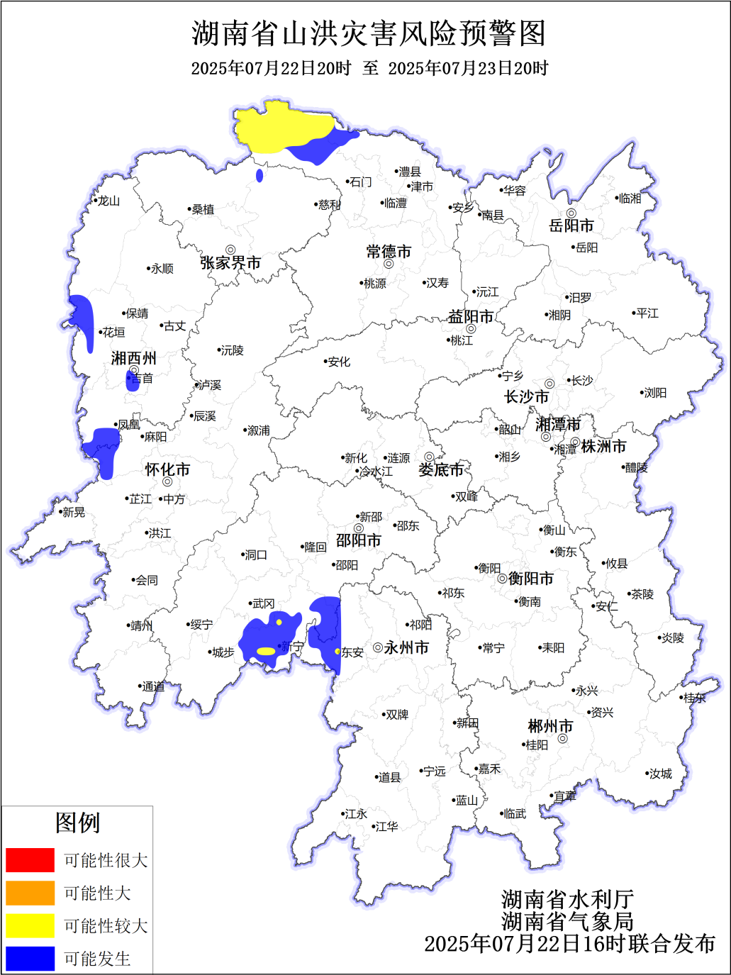 根据省气象局7月22日预报,省水利厅与省气象局联合会商得出如下结论:受降雨影响,22日20:00至23日20:00,邵阳市、常德市、永州市、张家界、怀化市、湘西州等局地可能发生山洪灾害,具体如下: