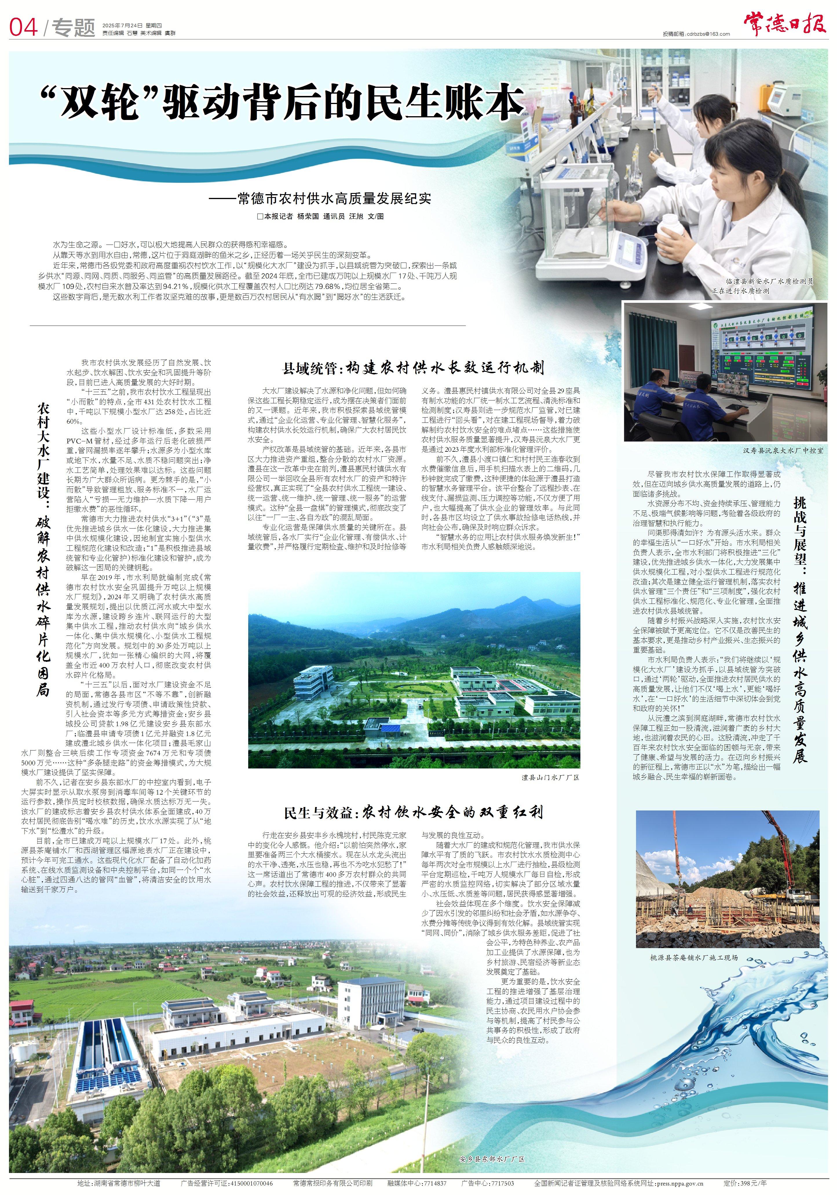 专业化运营是保障供水质量的关键所在。县域统管后,各水厂实行“企业化管理、有偿供水、计量收费”,并严格履行定期检查、维护和及时抢修等义务。澧县惠民村镇供水有限公司对全县29座具有制水功能的水厂统一制水工艺流程、清洗标准和检测制度;汉寿县则进一步规范水厂监管,对已建工程进行“回头看”,对在建工程现场督导,着力破解制约农村饮水安全的难点堵点……这些措施使农村供水服务质量显著提升,汉寿县沅泉大水厂更是通过2023年度水利部标准化管理评价。