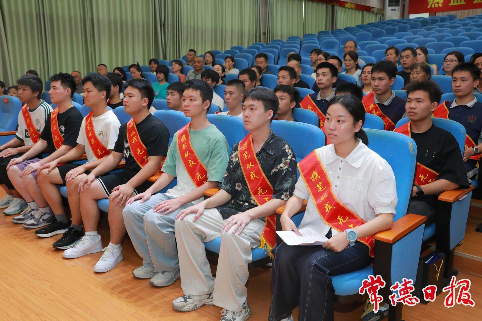 常德日报记者 刘清 伍银 文/图 7月24日下午3时,在鼎城区第一中学的大会堂上,一场以“青春向党 强军有我”为主题的军校新学员入学欢送大会正在举行。鼎城区19名应届高中毕业生肩披“携笔从戎 无上光荣”字样绶带,即将启航军旅梦。