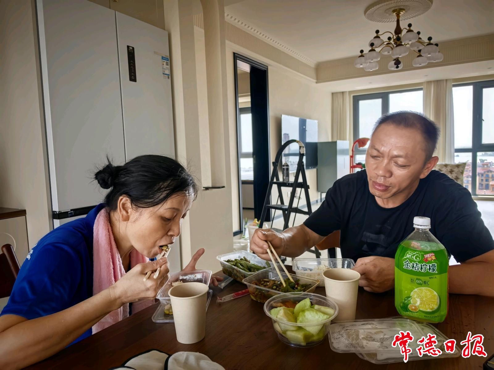 中午,趁着他们吃盒饭的空隙,记者和他们聊起天来。夫妻俩是鼎城区镇德桥镇人,前些年在一直在外打工,胡春林做建筑工人,周小英做客房保洁,但随着房地产市场低迷,工资越来越没保障。两人一合计,干脆回常德来干,可以照顾家里老小。就这样,两人一头闯入家政保洁的行当。一晃眼,今年已经是做这行的第五个年头。