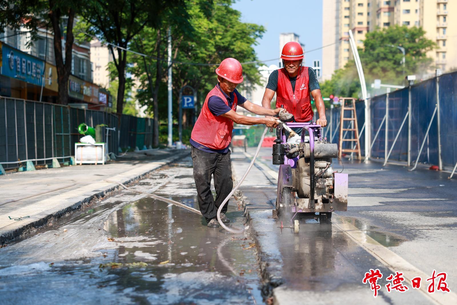 这个被围挡围成的“露天桑拿房”里,常德市自来水有限责任公司正组织众多施工人员紧密协作,奏响一曲独特的“交响乐”。两名施工人员推着切割机,全神贯注地切割沥青边线。他们身上的红色工装早已被汗水湿透,紧紧贴在后背,豆大的汗珠顺着安全帽的系带,沿着脸颊滚滚滑落。