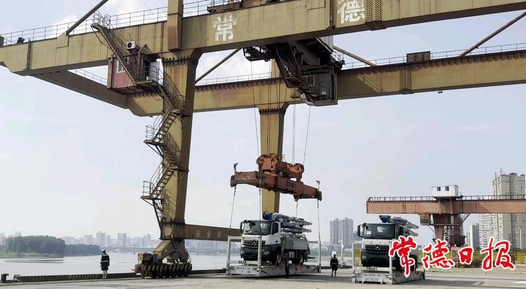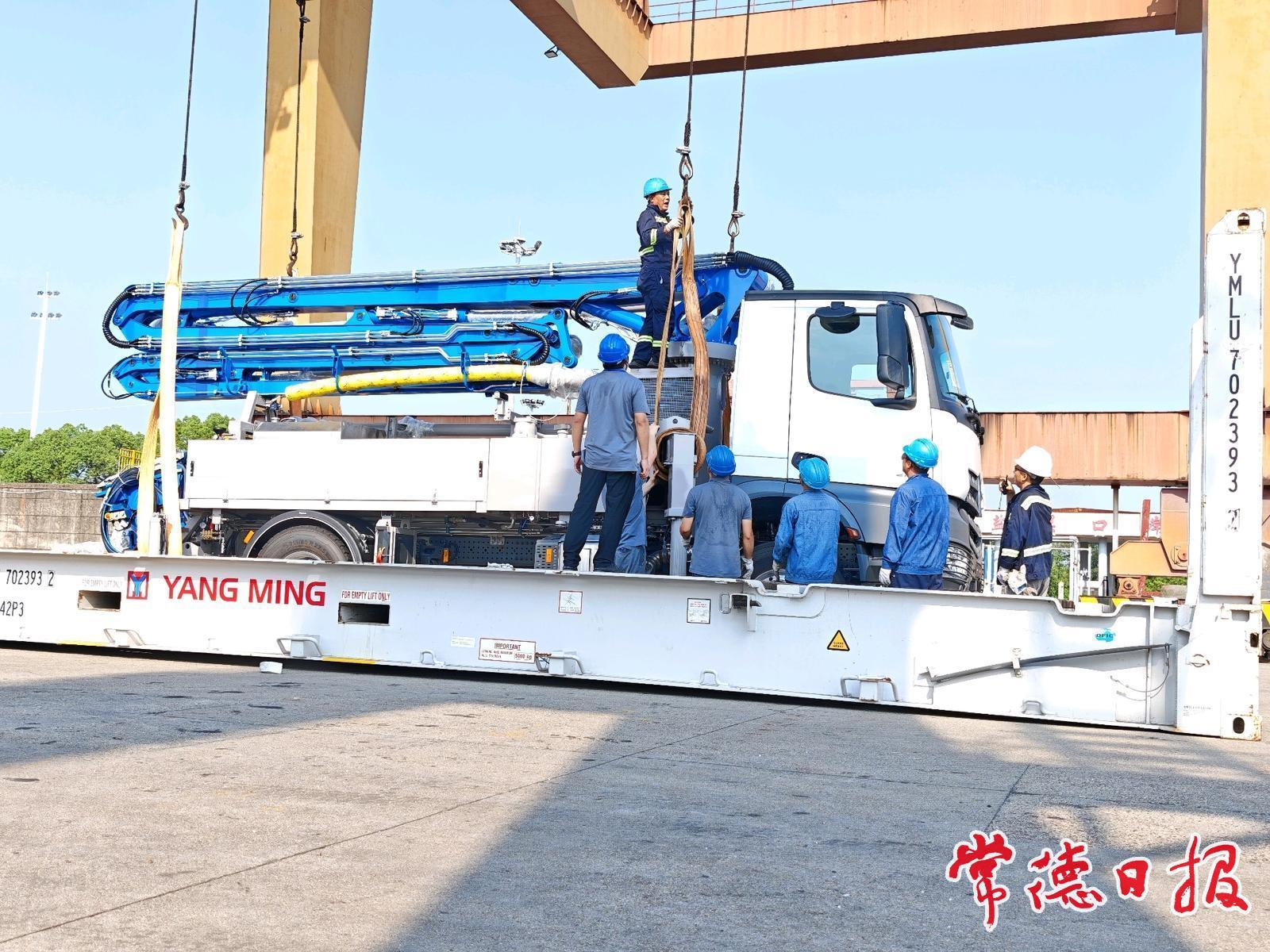 常德日报记者 胡秋菊 通讯员 蔡伟 文/图 8月1日下午,常德盐关码头,工作人员头顶烈日,分工协作,将湖南响箭重工科技股份有限公司生产的2台27米混凝土泵车装进特种集装箱框架柜,随后吊装上船。这2台“常德造”将搭乘湖南远洋集装箱运输有限公司的运输船舶,通过江海联运的方式运往欧洲。