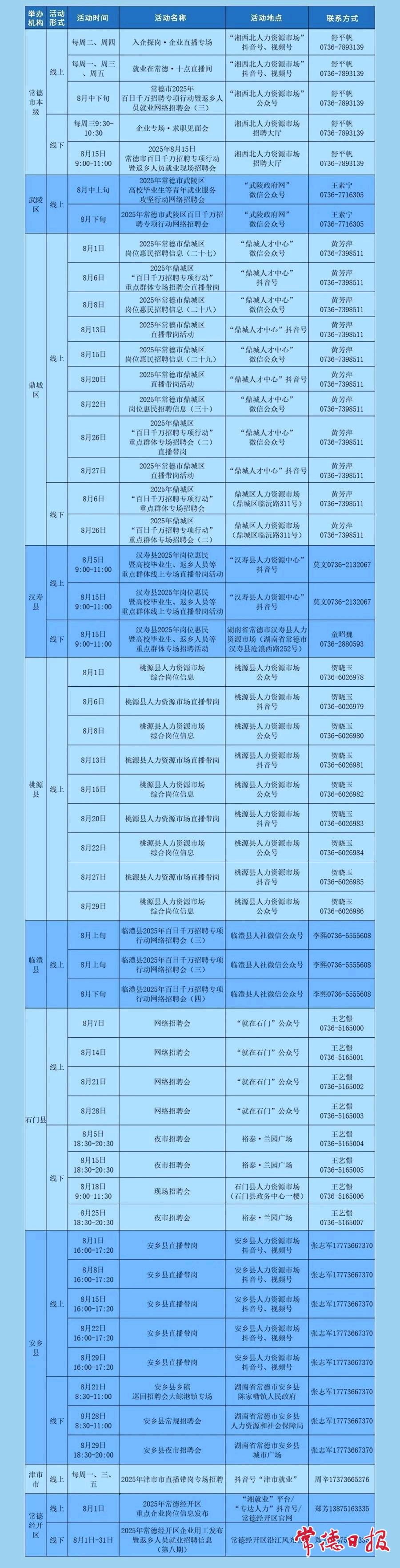 无法赶到现场的求职者同样机会丰富。全市将通过“湘西北人力资源市场”抖音号或公众号、“武陵政府网”微信公众号、“鼎城人才中心”微信公众号等平台,持续开展“直播带岗”与岗位信息发布等线上活动,确保就业信息触手可及。