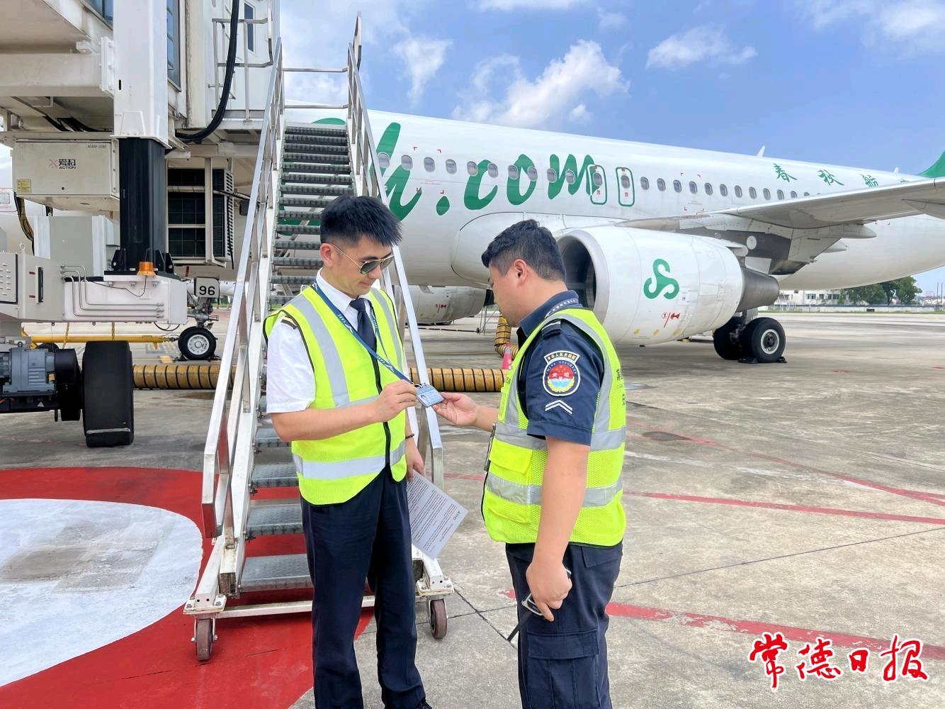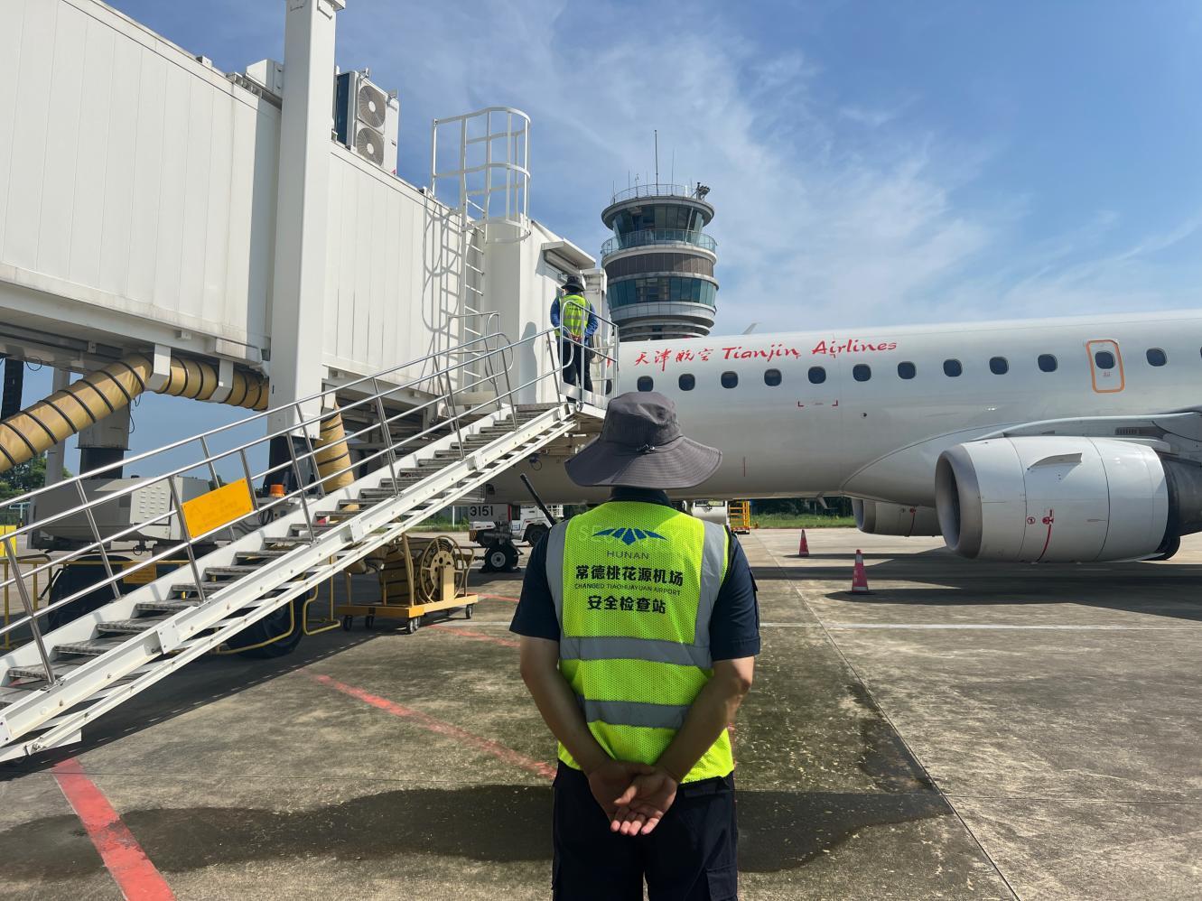 8月2日清晨,常德桃花源机场机坪已开启“炙烤模式”,一览无余地暴晒在热辣辣的阳光中。一群身着黑色制服的飞机监护员,又开始了一天的忙碌。
