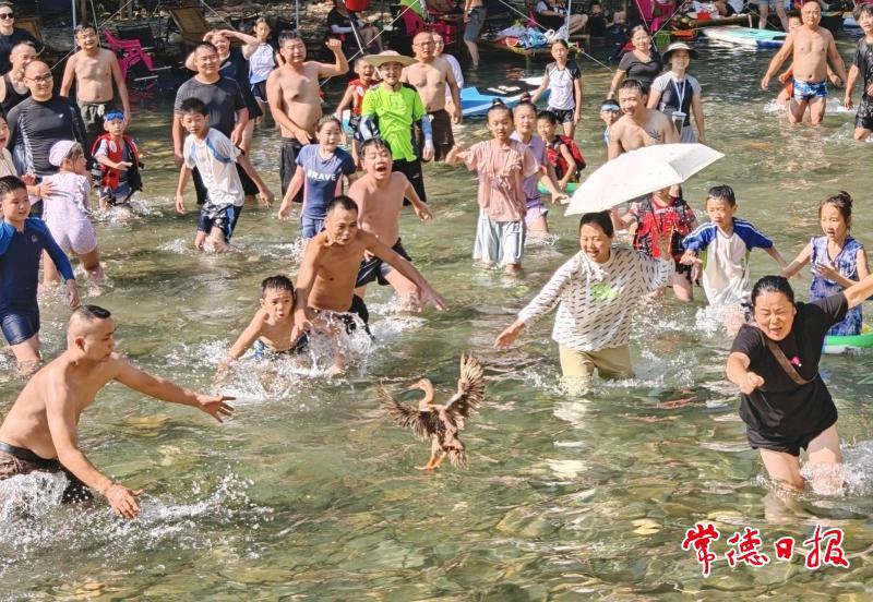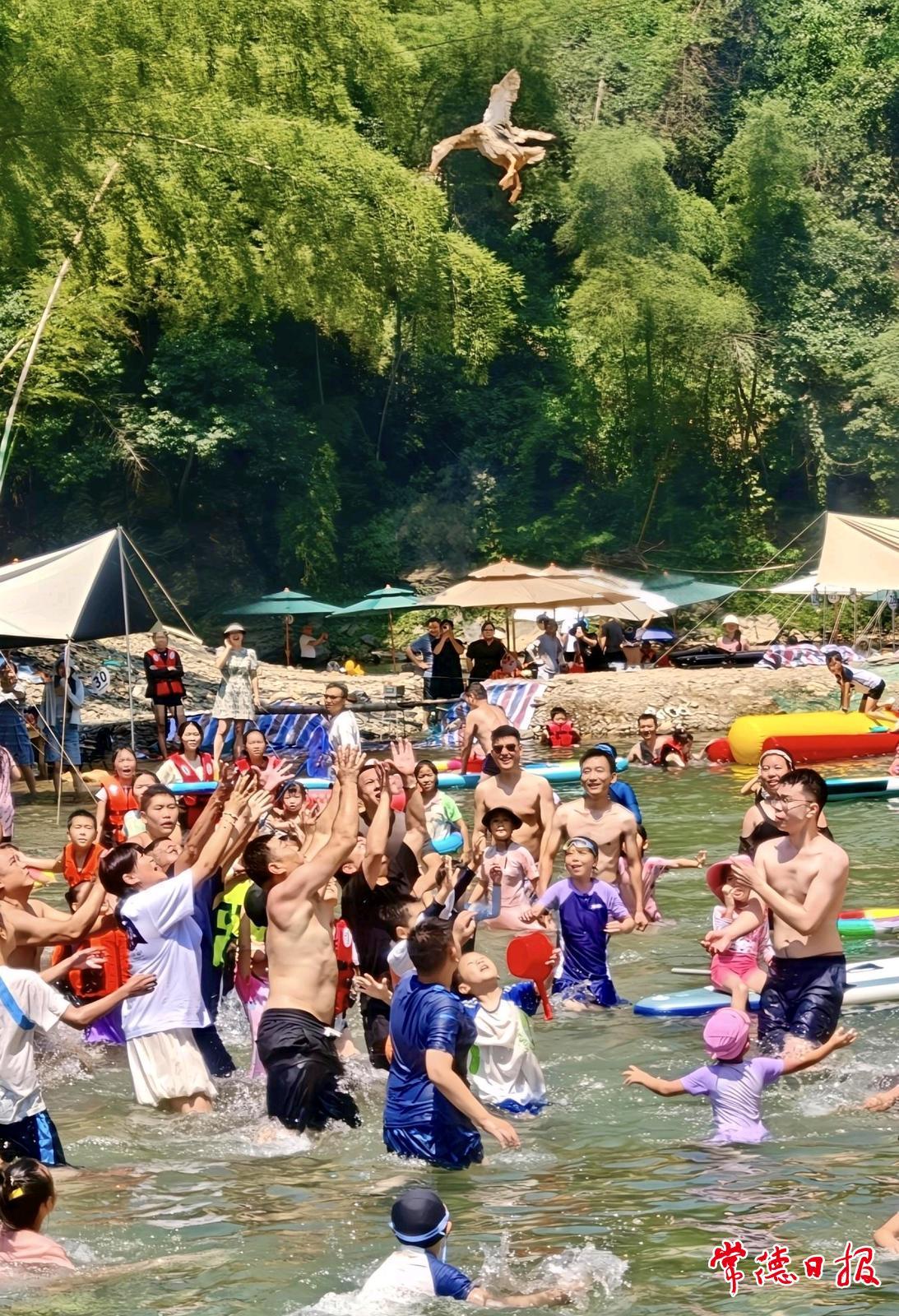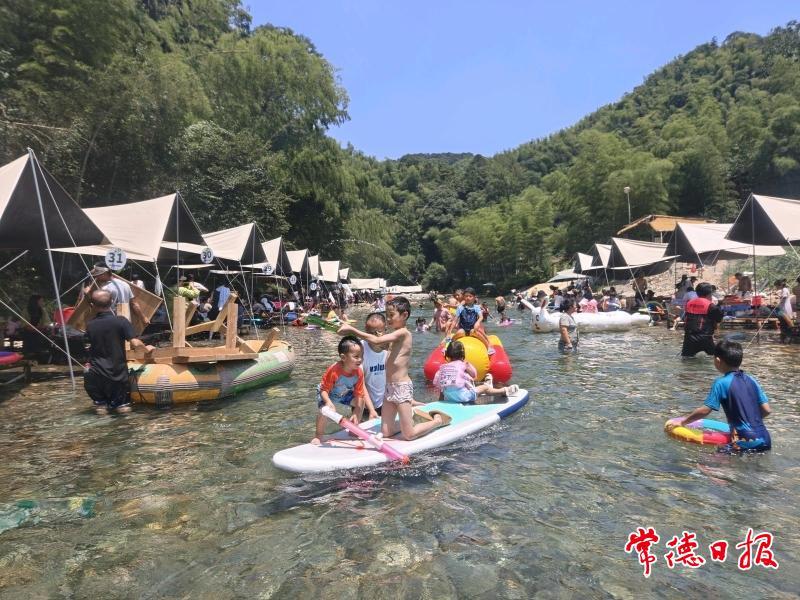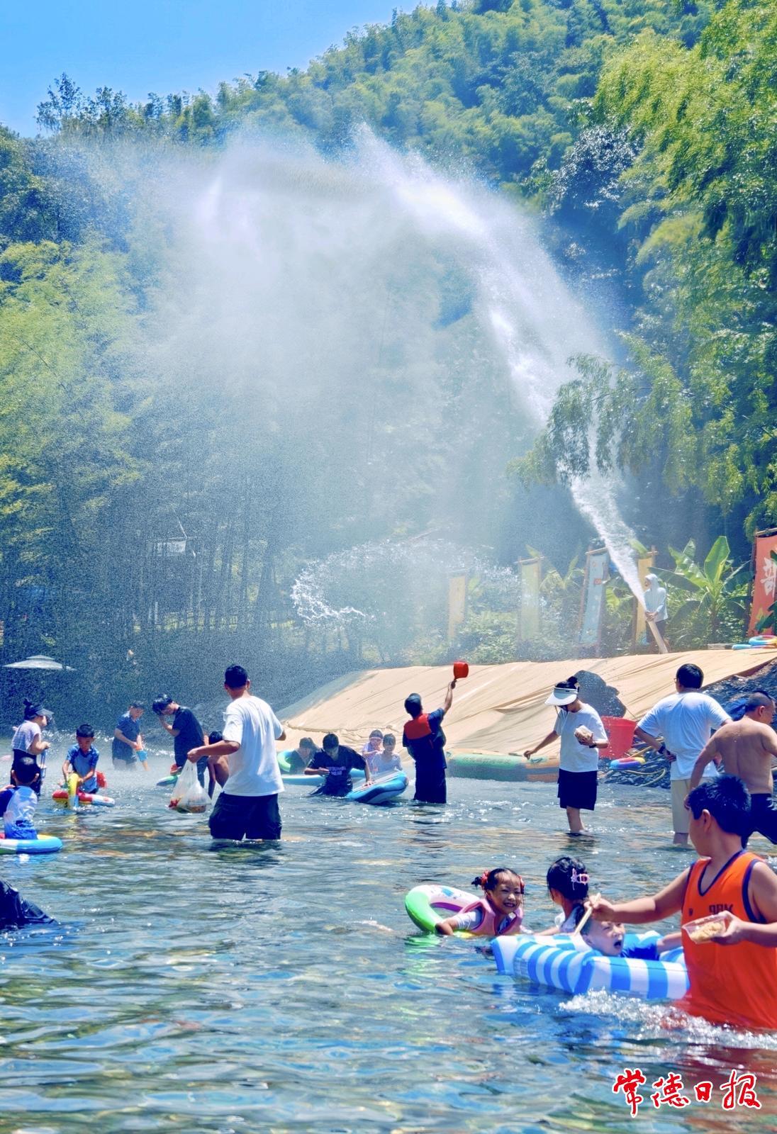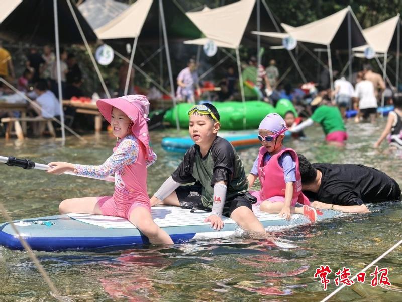连日来的高温天气,让市民纷纷寻找避暑好去处,桃源县沙坪镇欢竹溪水部落迎来了大批游客,成为消暑度夏的“新宠”。8月1日,记者在现场看到,前来游玩的市民游客络绎不绝。水上乐园里,市民游客尽情嬉戏,或在溪水中畅游,或是体验水上桨板、抓鸭子比赛、摸鱼比赛等水上娱乐项目。常德日报记者 刘颂 摄
