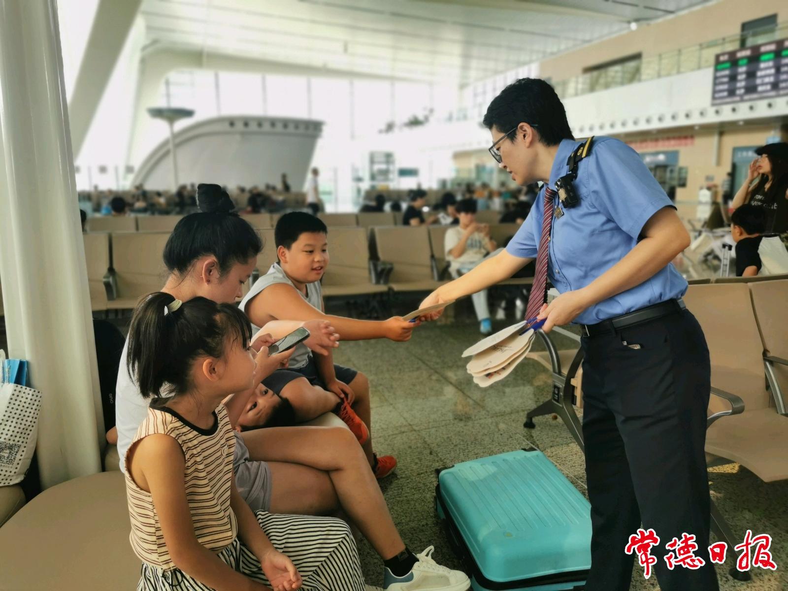 为了强化暑运儿童安全,常德火车站定制了一批宣传扇免费发给旅客,温馨提示广大旅客看护好随行儿童,不要让儿童在候车室、站台上追逐打闹,大声喧哗,家长不要让儿童远离视线;注意扶梯安全,不要让孩子攀爬扶手倚靠边缘,避免手脚伸入电梯缝隙或触碰电梯按钮,尤其是在站台上下车时,家长一定要注意儿童脚下安全,防止儿童意外掉落轨道。