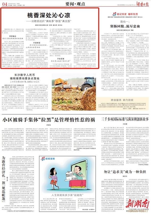 前不久,第三届炎陵黄桃文化季暨2025年第11届炎陵黄桃大会,发布“湘赣之巅·云端避暑”高山秘境线、“中华始祖·寻根养生”非遗特色线、“红色圣地·清凉养心”采摘甜蜜线等旅游线路,将炎陵黄桃产业与丰富的旅游资源深度融合,为游客提供独特的夏日避暑旅行体验。