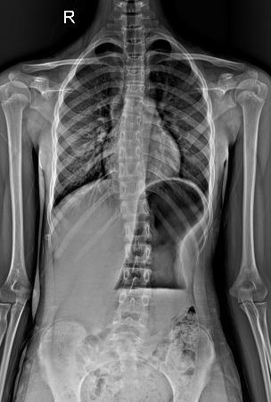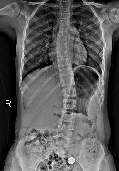 一年前,小圆父母察觉到孩子异常——耸肩驼背、双肩与腰部明显不对称。最初以为是学业负担重所致,但症状持续未见好转。今年4月,家人带她前往常德市第一中医医院求诊。检查结果令人揪心:脊柱全长片清晰显示其胸椎向右弯、腰椎向左弯,形成典型“S”形,胸椎4-10节及胸11至腰4节Cobb角分别达14°与25°,脊柱柔韧性为75%。