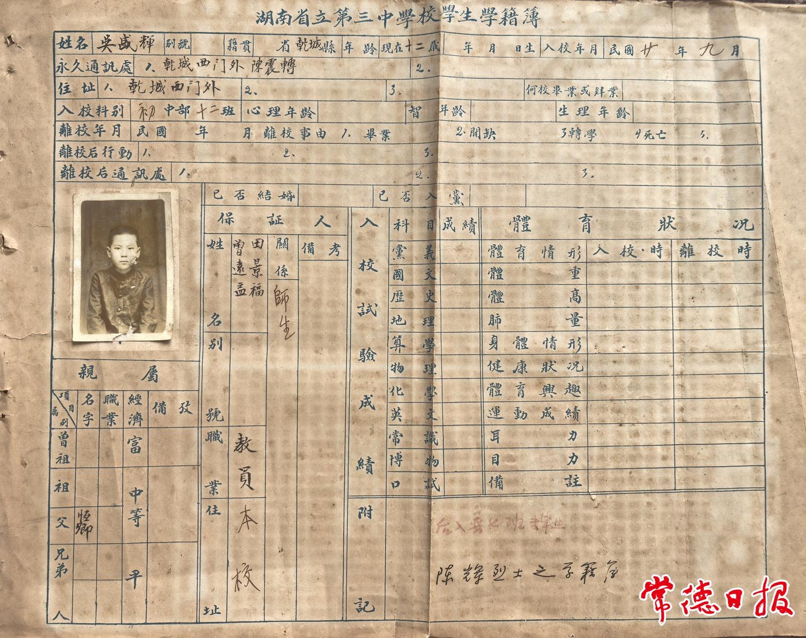 陈辉到底长什么样子?在常德市第一中学尘封已久的档案中,一张一寸大小的黑白照片,贴在陈辉的《学籍簿》上。那是12岁的陈辉,当年刚考入省立三中初中部。1935年升入该校高中普通科第七班。1938年2月,陈辉入党。三个月后,陈辉结束学业,“把自己抛到战火最响亮的地方去”。