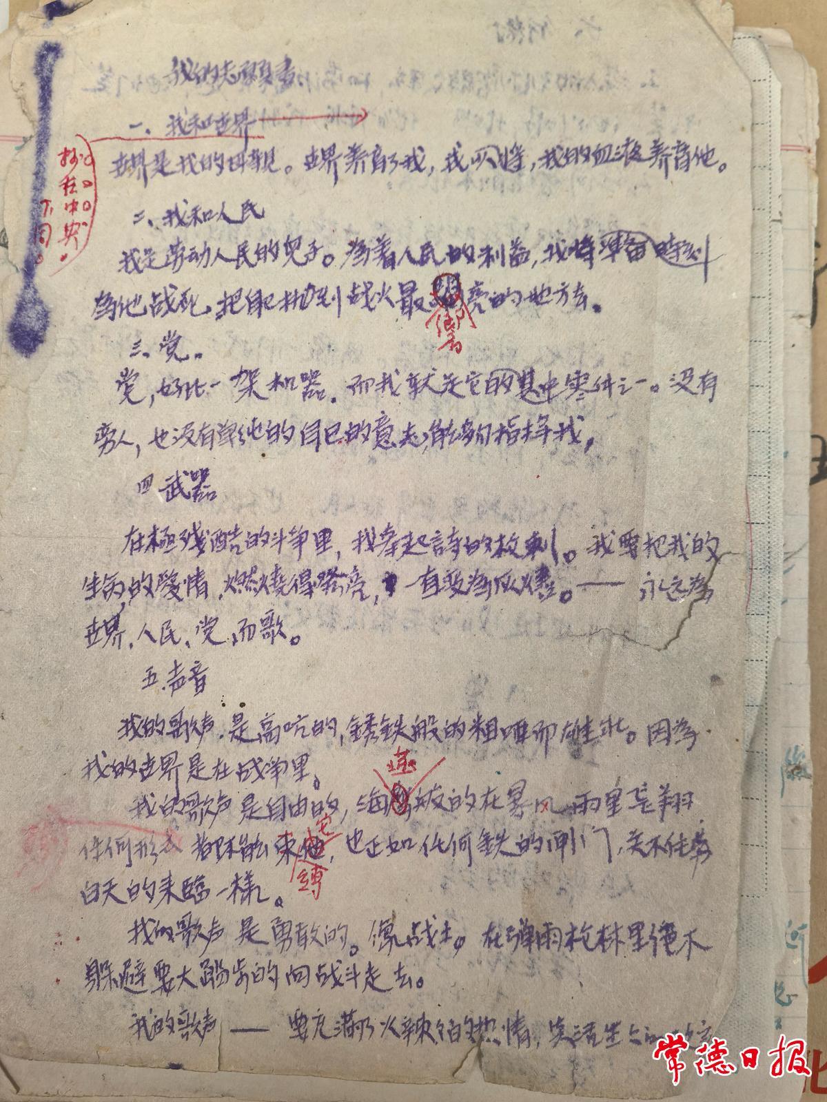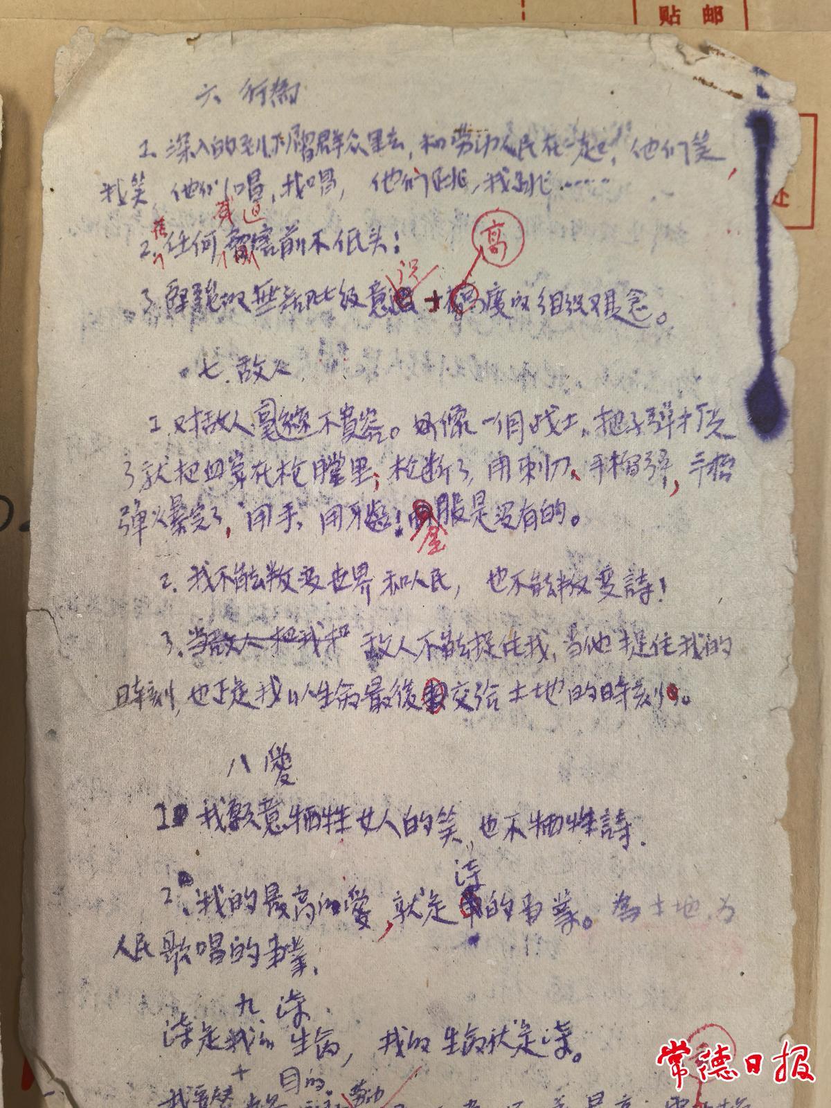 一个早已残破褪色的布面硬壳夹子里,装着几个大小不等的笔记本和油印件,内容有家书、诗歌、散文、歌曲、学习心得、工作笔记、日常开销记录,还有一张保存完好的“抗日军政大学第二分校”毕业证。那些文字,用不同颜色的墨水写成,红色的蓝色的黑色的,诗稿上都有多处修改的痕迹,落款也是不同的时间和地点,有些甚至还注明“写于病中”“草于病中”“吐血后之黄昏”。这是一名年轻战士六年生命历程的记录,也是80多年前华北抗日战场的真实再现。