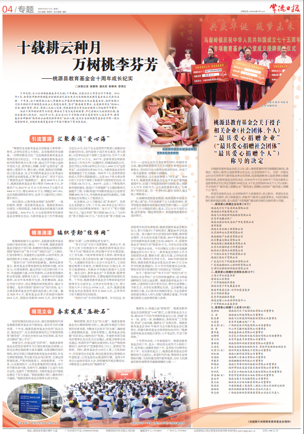十年栉风沐雨,十年砥砺前行。桃源县教育基金会的十年,是从一株幼苗长成参天大树的十年,是用爱心浇灌希望的十年,是用坚守诠释责任的十年。站在新的起点上,桃源县教育基金会将继续坚守公益初心,彰显时代价值,聚焦师生急难愁盼问题,为加快建设现代教育强县、办好人民满意的教育凝聚更多温暖磅礴的力量……