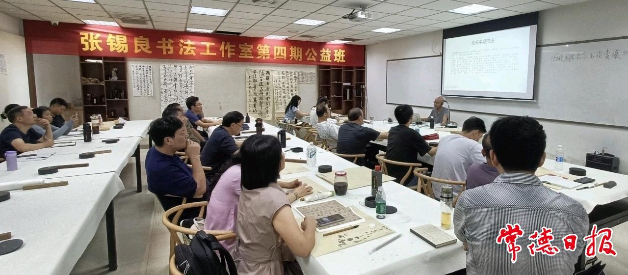 常德日报记者 江一舟 通讯员 杨雅姝 文/图 8月10日,张锡良书法工作室第四期公益培训第四次课程在常德市文化馆温情启幕。本次课程聚焦“宋代书法简析”,常德市文化馆副馆长、张锡良书法工作室成员郭宏忠化身时光向导,引领学员们跨越千年时光,感悟宋代书法的魅力。