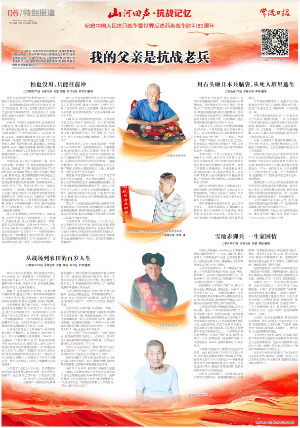 为铭记历史,弘扬伟大的抗战精神,常德市档案馆特联合常德日报社开展“我的父亲是抗战老兵”口述实录专题采访。从战火中走来,在血脉里生根,让我们和老兵后代一起,感受最炽热的爱国情怀,向着民族复兴的伟大梦想奋勇前行。