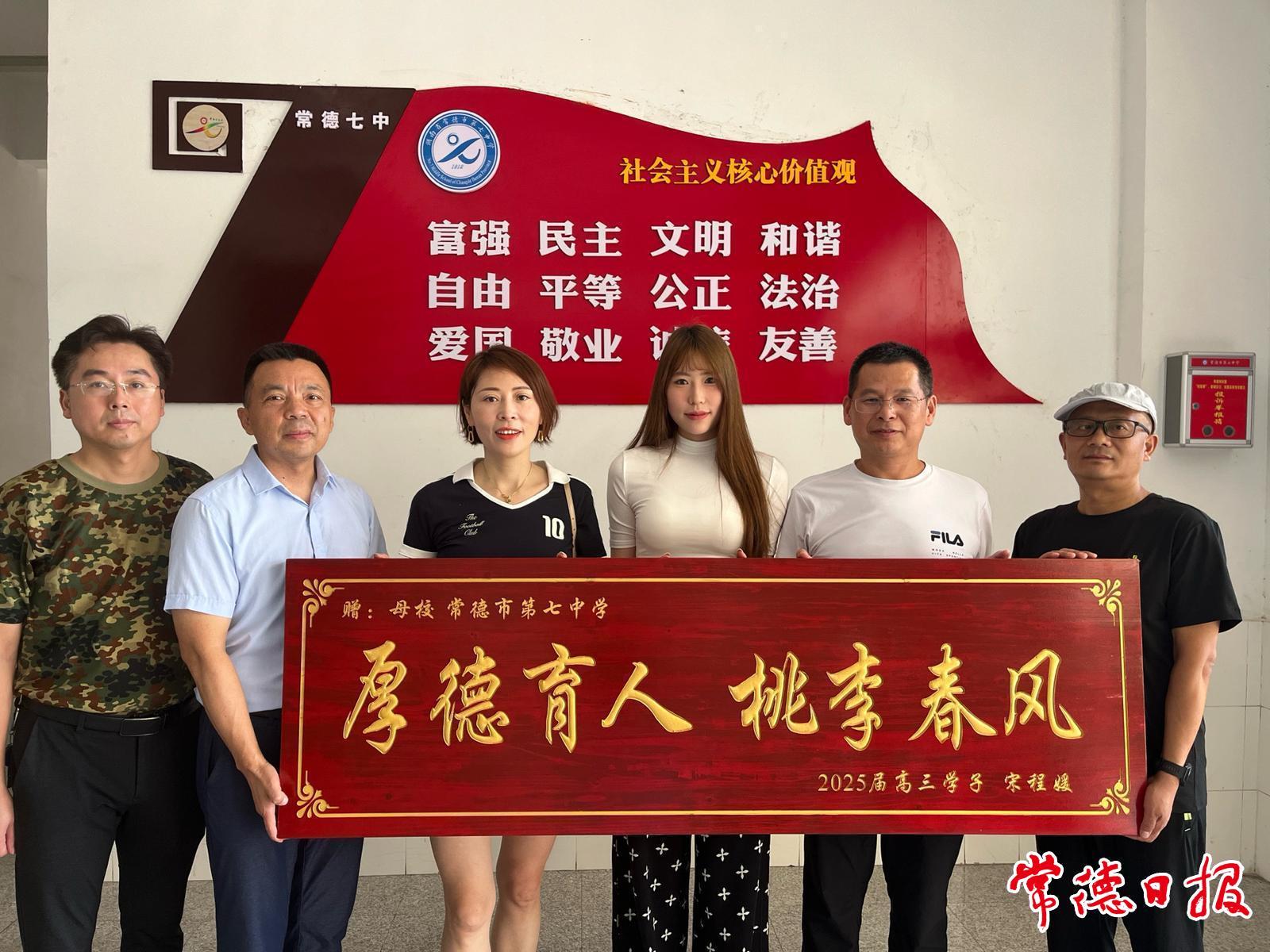 常德日报记者 黄云霞 通讯员 刘靖诗 文/图 近日,常德市七中2025届毕业生宋程媛和家人将一块镌刻“厚德育人 桃李春风”字样的牌匾赠予母校,以此表达对学校领导和老师的感激之情。