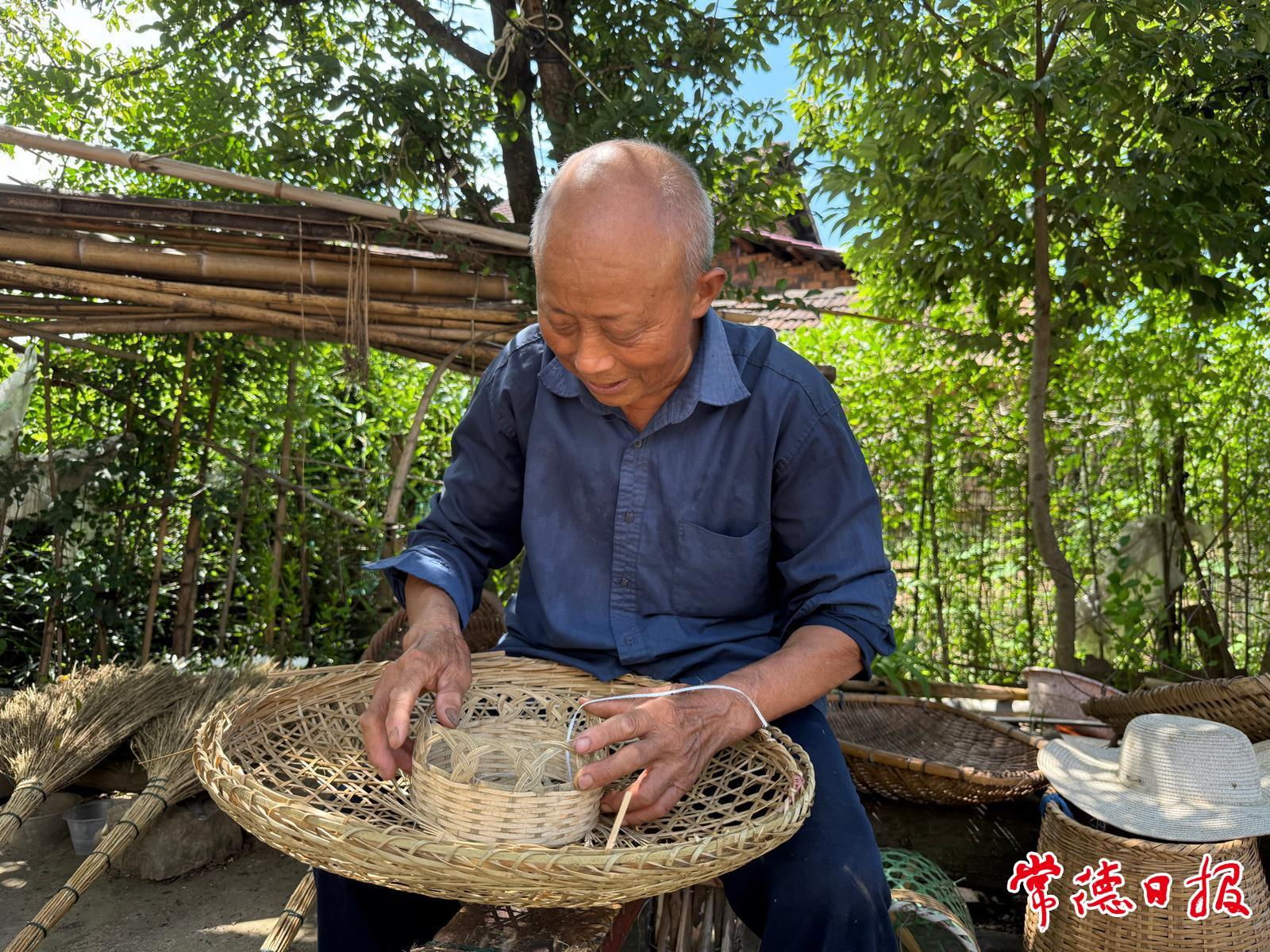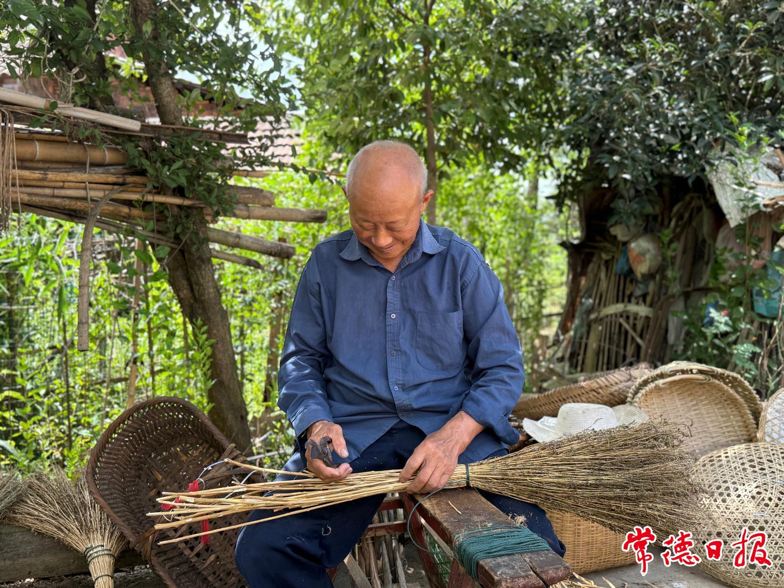 60多岁,张大日重拾老手艺,编织的簸箕、竹篓、斗笠、筛子除了自家用,非常受邻居们欢迎。之后,他还向村里手艺好的人拜师学扎铁扫帚。后来,他在自家菜园里种了“铁扫帚”。“春天撒草籽,秋天收割,等晒干了就扎成扫帚卖,还能换一些零用钱。”张大日老伴说道。