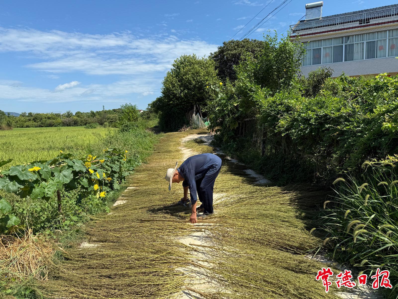8月26日上午,天气炎热,张大日在自家禾场晒刚收割不久的铁扫帚,这个两层楼的小院在太阳山脚下,屋外就是稻田,非常敞亮,空气也很新鲜。禾场的一角则摆放着他编的一些生活器具,如簸箕、扁担、斗笠、竹篓等。张大日手握篾刀,熟练地将竹片削成篾条。