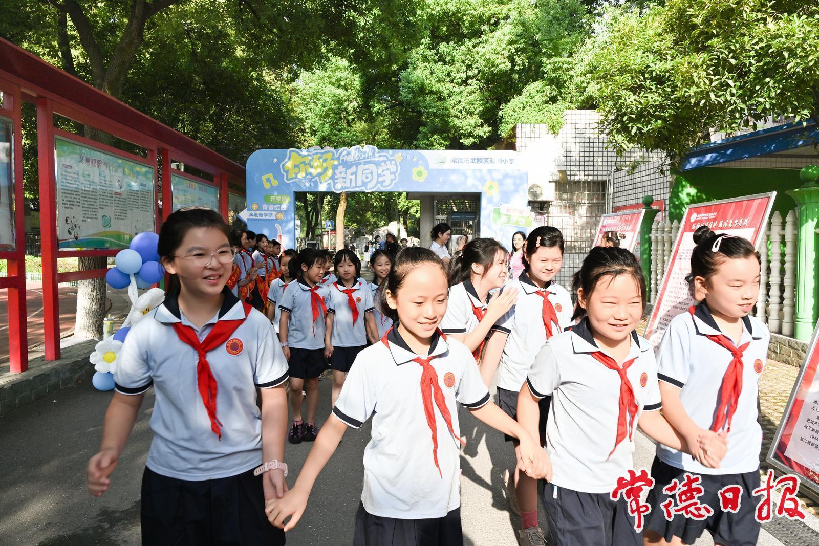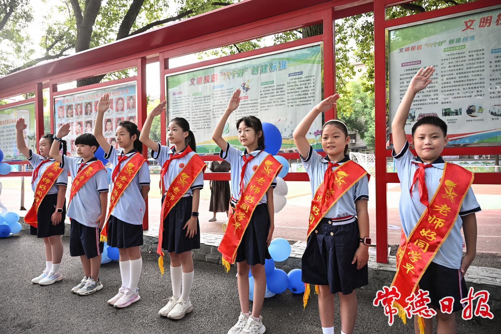 常德日报记者 姚璇 文/图 8月31日清晨,阳光洒在常德市武陵区滨湖小学操场上。沉寂了一个暑假的校园再度沸腾,孩子们穿着整洁的校服、佩戴鲜艳的红领巾,快步穿过写满“你好新同学”“新学期新梦想”等标语的卡通拱门。与往常不同的是,这一次,迎接他们的不仅是老师和同学,还有一群声音稚嫩却目光坚定的“小小红色宣讲员”。