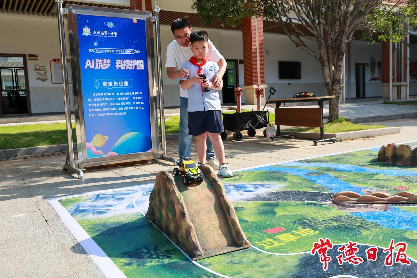活动针对不同年级精准设计,如一年级学生参观校园,体验部分科技项目;三年级学生争当“我是小小军事迷”,体验“打靶归来”、“重走长征路”、“坦克大战”等项目活动,过足了“军事瘾”;五年级学生观看《砥柱中流》《永不尘封的档案》等抗战纪录片,感悟先烈初心。活动现场,最受学生欢迎的是“重走长征路”,学校以长征路线为蓝本,在特制地图上还原“过草地”“渡赤水河”等标志性场景,学生操控科技遥控车穿梭其中,通过精准调整车速、控制转向跨越底图上的模拟险阻,沉浸式感悟长征精神,让红色记忆在实操体验中沁入学生心间。此外,“神舟N号水火箭”“红旗飘扬无人机”等项目同样科技感拉满,吸引学生驻足探索。