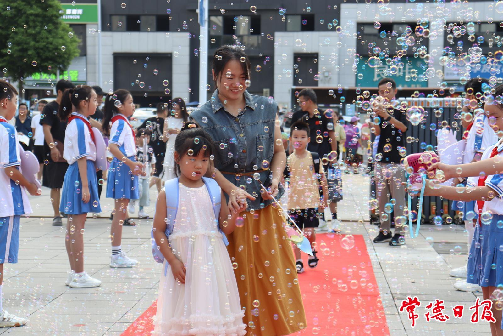 8时30分,一年级新生在家长的陪伴下踏入校园。在通往教学楼的红地毯上,红领巾志愿者夹道欢迎,他们用时光泡泡机绘制出童趣海洋,用热情问候与贴心帮助让新生感受到校园的温暖。