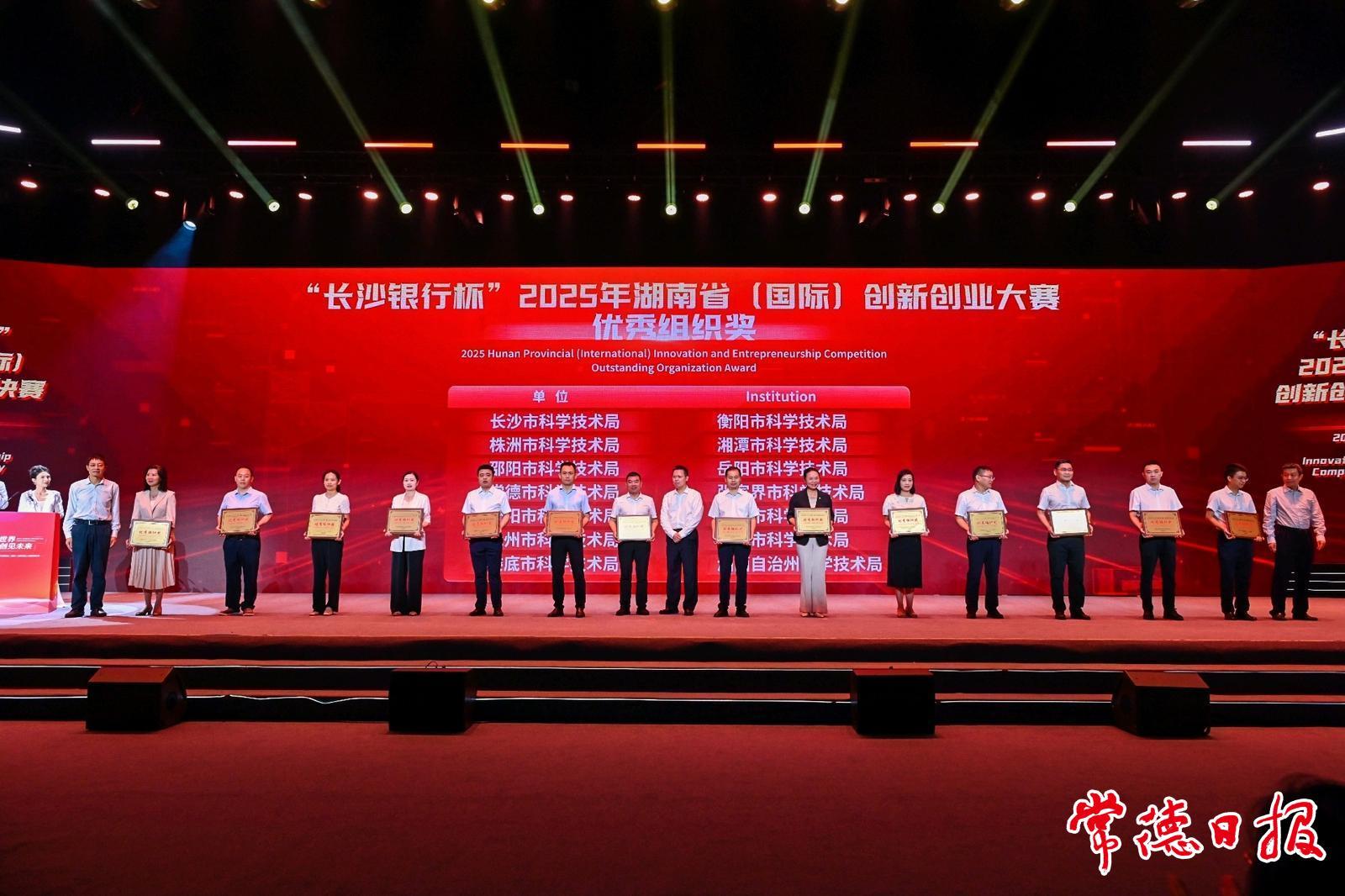 常德日报记者 江一舟 通讯员 李杰 谭凯 文/图 8月29日,2025年湖南省(国际)创新创业大赛总决赛落幕,常德市在此次赛事中斩获11项荣誉——1个项目获主体赛小微组三等奖,1个项目获颠覆性技术创新大赛十强奖,8个项目荣获主体赛优秀奖,获奖数量位列全省市州第三,常德市科学技术局荣获全省优秀组织奖。