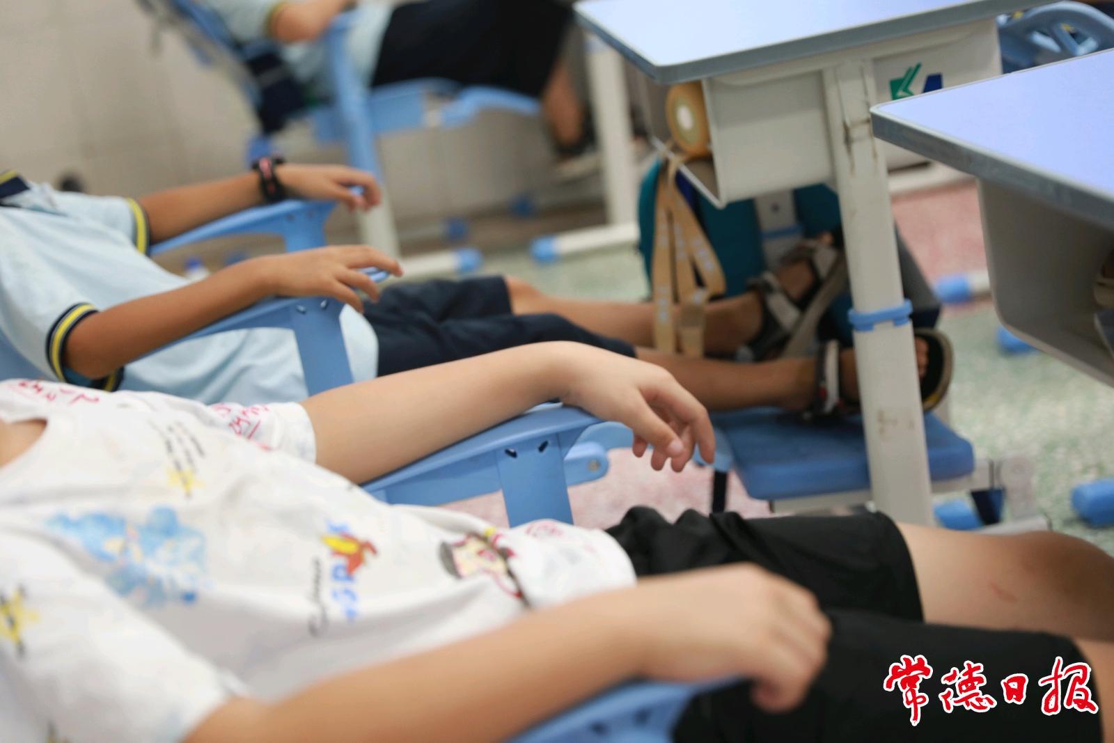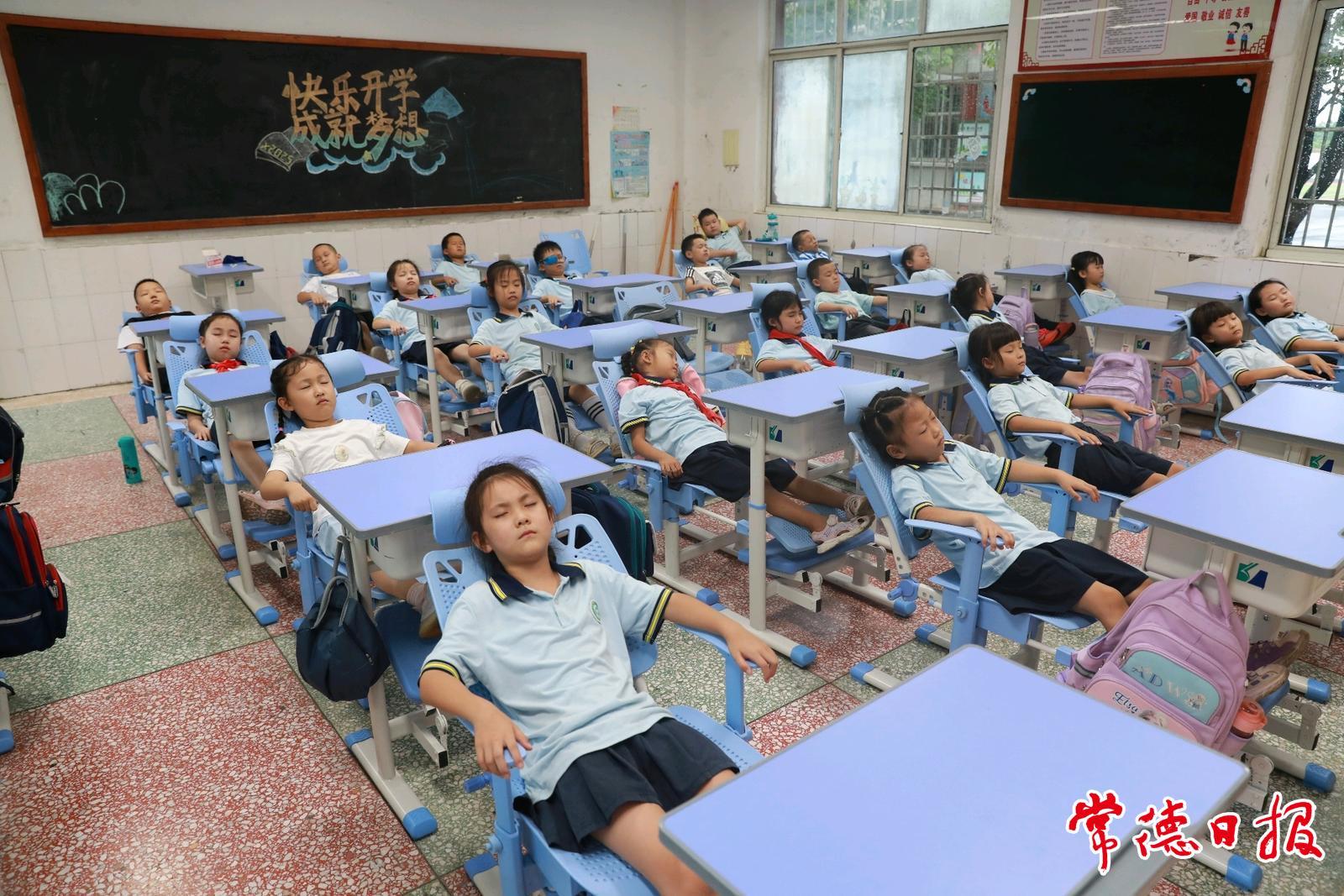 常德日报记者 江一舟/文 李龙/图 “这个午休课桌椅好好用呀!我自己动手就能调整好。”9月2日中午,武陵区丹洲乡中心小学二年级108班教室内,同学们三三两两回到座位,熟练地把书本塞进书包,接着握住课桌椅侧边的调节杆轻轻一扳,原本竖直的椅背缓缓向后倾斜,大家顺势躺靠在椅背上,老师贴心地关掉教室内的灯光,整个班级瞬间进入安静的“躺睡”模式。
