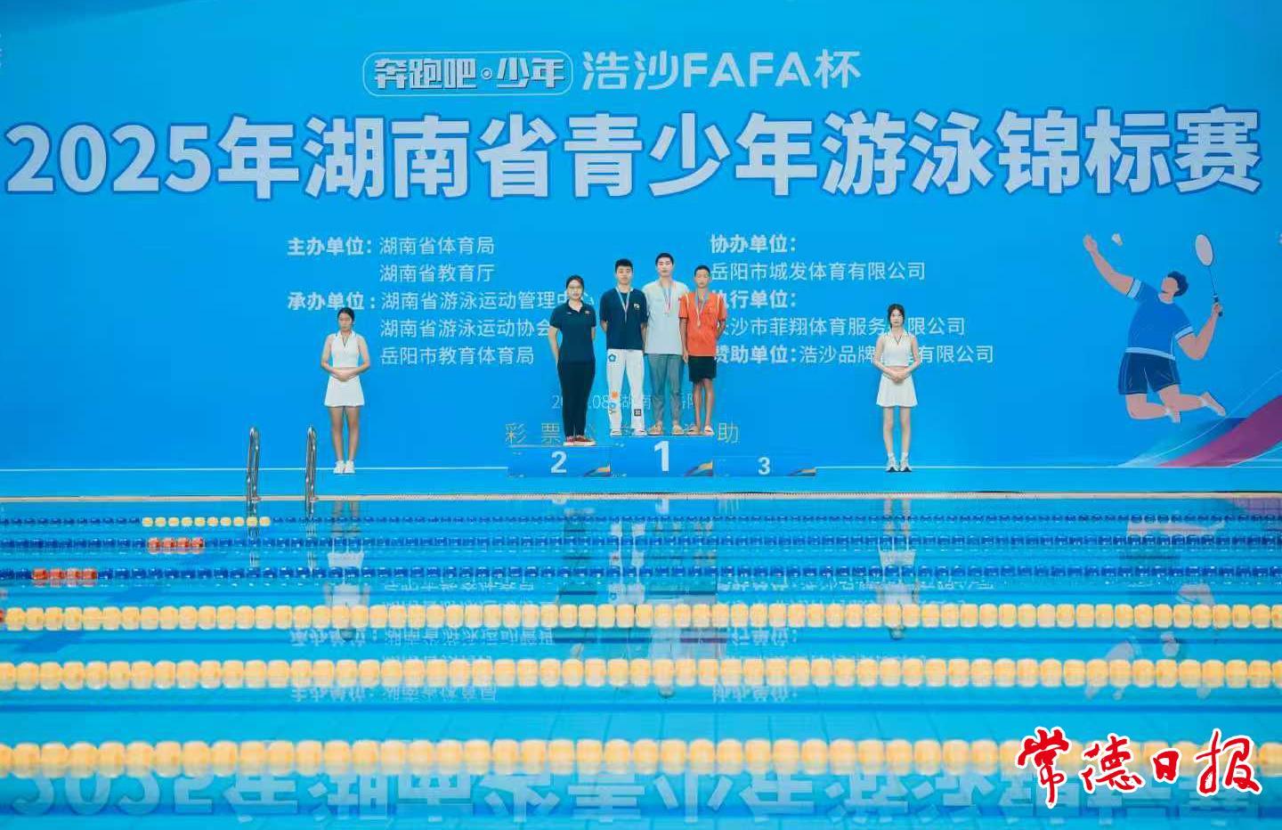 常德日报记者 裴维维 通讯员 李胜平 孙恺羚 文/图 8月29日,2025年湖南省青少年游泳锦标赛在岳阳市圆满收官。作为全省青少年游泳项目最高水平赛事,本次赛事吸引来自全省14个市州的699名青少年泳将同场竞技。其中常德代表队共派出69名运动员参赛,最终斩获12枚金牌、21枚银牌、13枚铜牌,金牌总数位列全省第二,再次印证了常德在湖南青少年游泳领域的传统优势地位,彰显了常德青少年游泳项目的深厚底蕴。