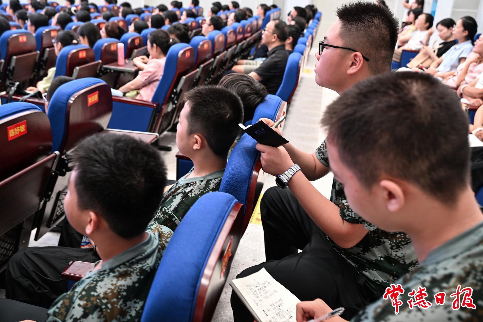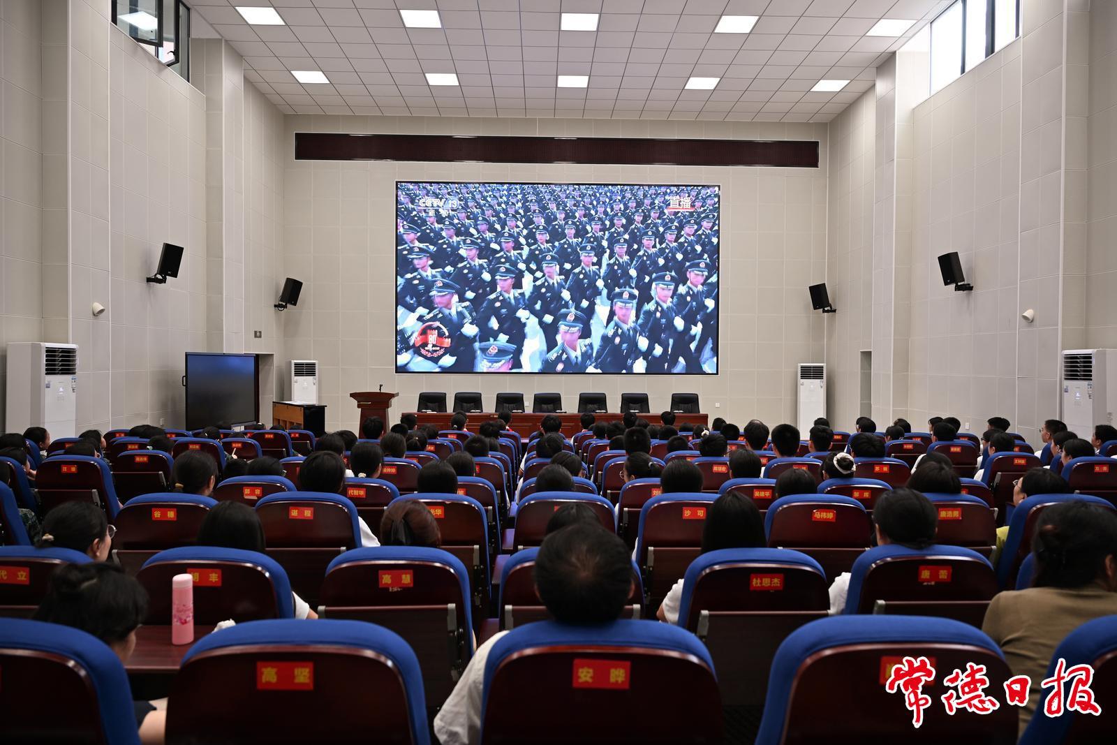 常德日报记者 姚璇 文/图 9月3日上午,炽热的阳光照耀着常德市第五中学的操场,正在进行军训的七年级学生身着迷彩服,青春昂扬。训练间隙,学校组织全校学生前往阶梯教室和各班教室集中收看纪念中国人民抗日战争暨世界反法西斯战争胜利80周年大会直播,共上一堂生动的国防教育课。