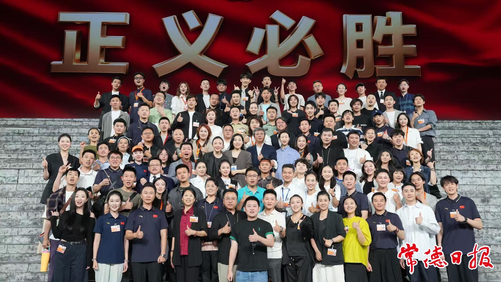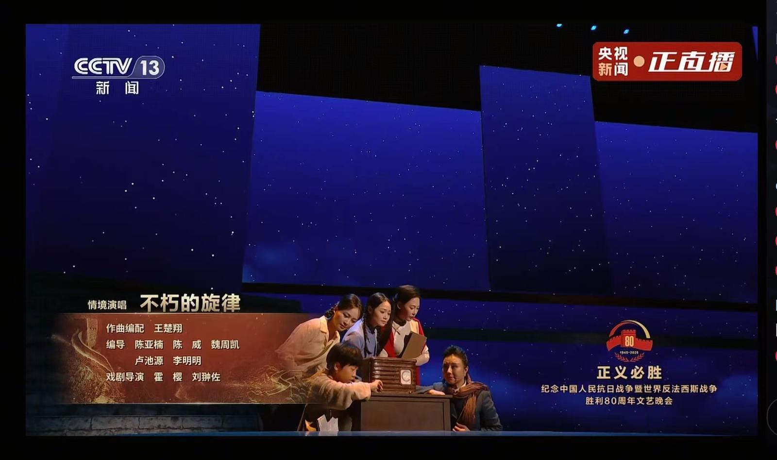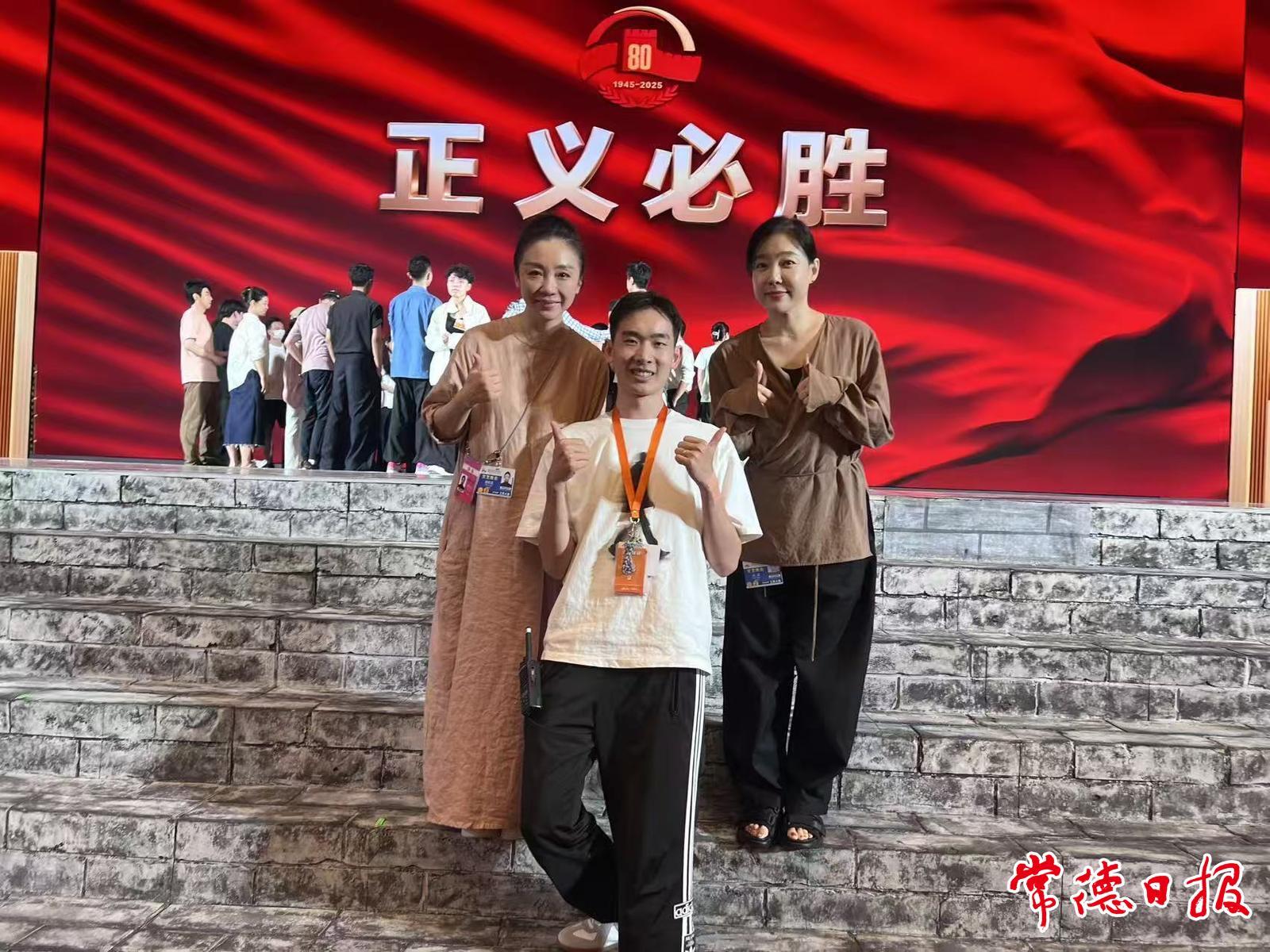 常德日报记者 黄云霞 通讯员 刘靖诗 文/图 9月3日晚,人民大会堂内,纪念中国人民抗日战争暨世界反法西斯战争胜利80周年文艺晚会《正义必胜》震撼上演。常德市七中2016届毕业生陈威担任晚会第四章《共同的黎明》的《不朽的旋律》《无名者勋章》编导,用音乐舞蹈史诗剧讲述抗战故事。