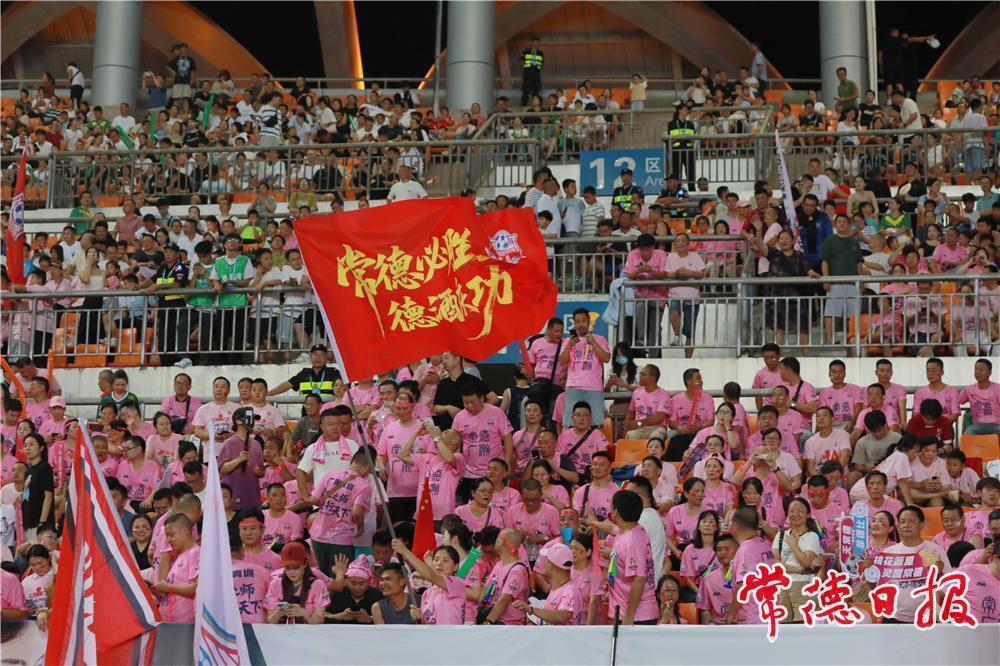 当晚,现场座无虚席,近3万名球迷尽享足球狂欢,为队员们呐喊助威,将赛事气氛烘托得愈发浓烈。19时38分,随着主裁判哨声一响,身着粉白相间球服的常德队与身着绿色球服的郴州队进入比赛,瞬间点燃全场。上半场一开场比赛就进入高潮。开场2分28秒,常德队10号球员赵文荻一脚推射,拔得头筹。