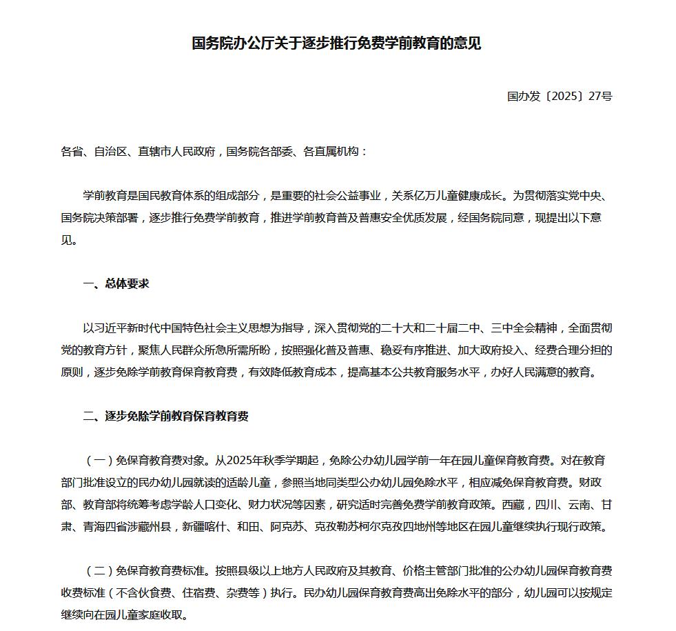 后续国家将统筹考虑学龄人口变化、财力状况等因素,研究适时完善免费政策,让更多孩子受益。因免保育教育费导致幼儿园收入减少的部分,由中央财政和地方财政对幼儿园给予补助。