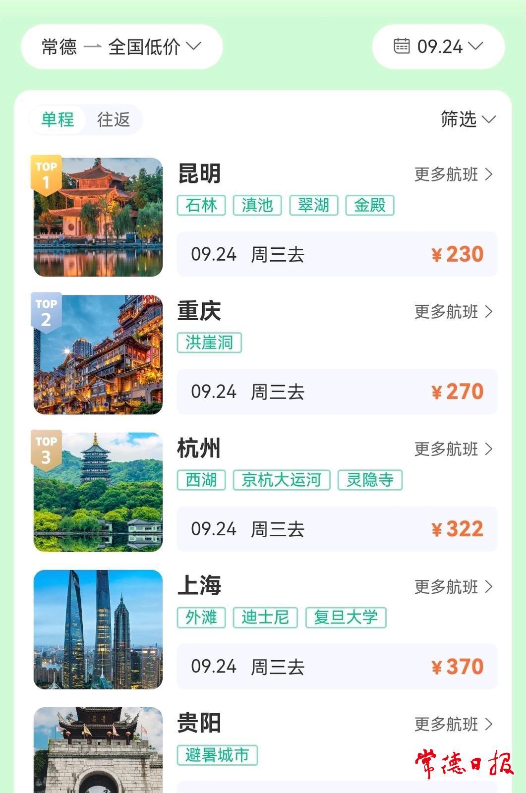 常德日报记者 胡秋菊 文/图 距离国庆中秋长假只有十多天了,记者在第三方售票平台看到,9月中下旬,从常德出发前往昆明、重庆、杭州等热门旅游城市的机票价格大幅下降,“2”字头机票并不鲜见。