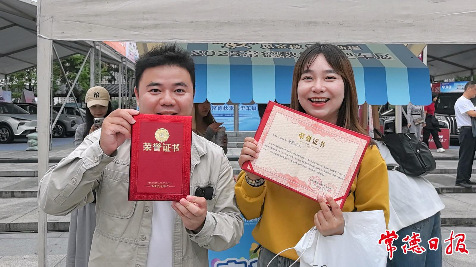 常德日报记者 贵捷 曾楚乔 实习生 唐文萱 文/图 9月20日,2025常德白马湖秋季新能源车展短视频大赛领奖环节在车展现场开启,获奖选手纷纷来到现场领取奖金。热闹的领奖场景与展区持续升温的观展氛围相互映衬,成为车展现场又一亮点。