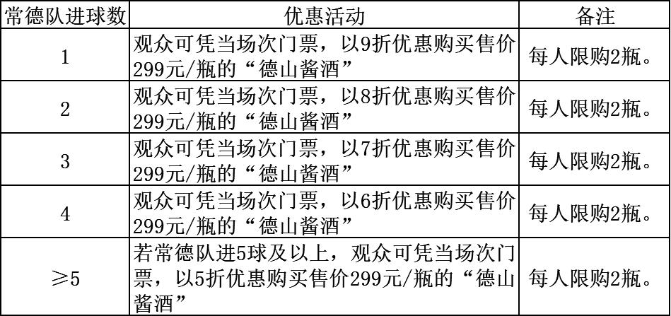 赛事期间,只要常德队参与的比赛(无论主场或客场作战)有进球记录,现场观众均可凭该场次电子票,前往德山酒业指定地点享受“德山酱酒”折扣优惠。