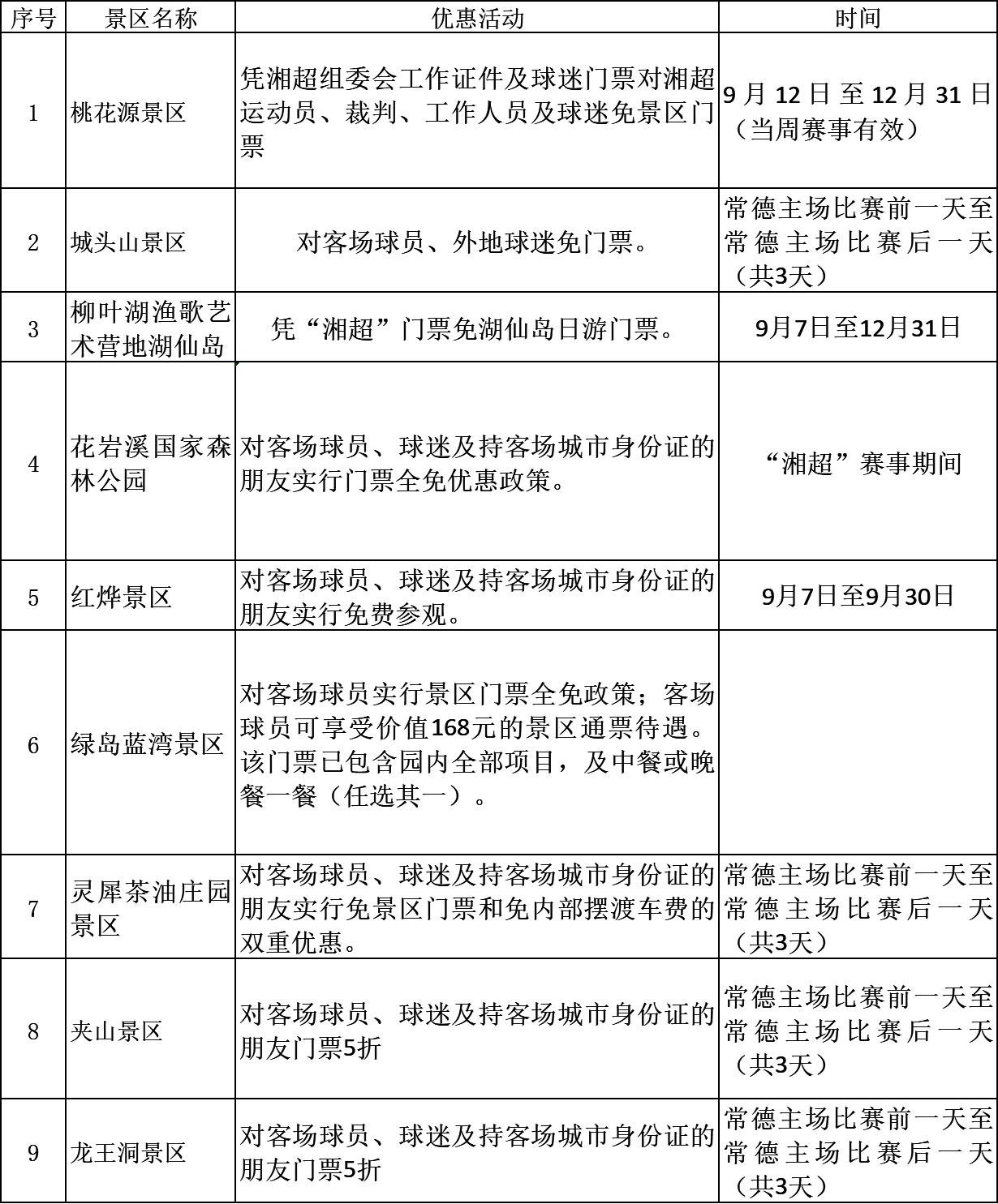 “湘超”赛事期间,常德市面向参赛人员及广大球迷推出文旅专属福利,诚邀大家在观赛之余畅游本地山水、感受文化魅力。此次福利覆盖常德9大热门景区,其中桃花源、城头山等景区实行门票免费政策,夹山、龙王洞景区提供门票半价优惠。需注意的是,各类优惠主要面向参赛人员及球迷,各景区适用对象与有效时间有所不同,请您仔细查阅下表具体安排,提前规划行程。