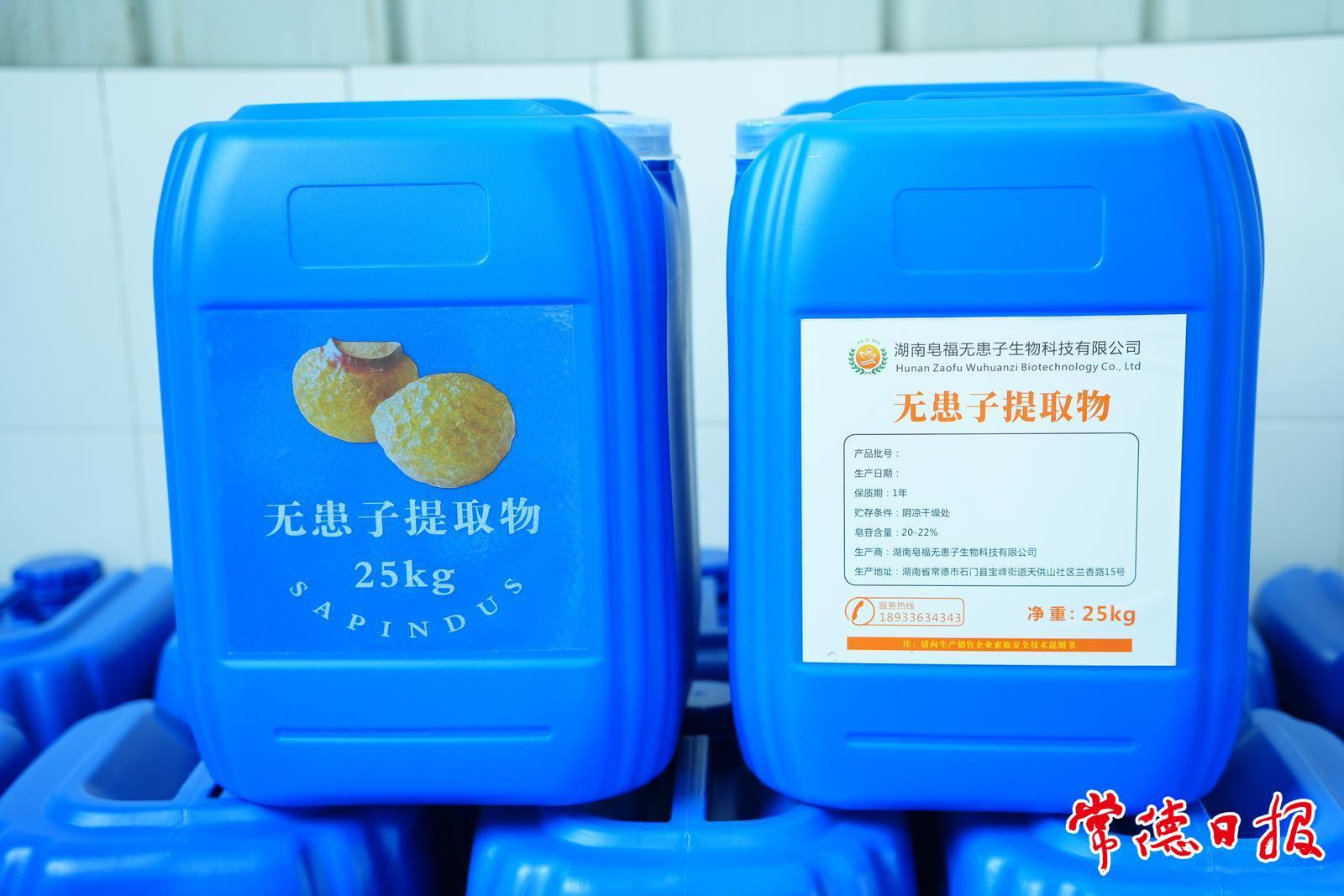 2018年11月,湖南无患子农林发展有限公司旗下成立湖南皂福生物科技有限公司。2019年,公司投资5000万元建成全国首条年产4000吨水提皂液的加工生产线,而后又在县政府的建议下,将广州的几类深加工产品迁回石门生产,无患子洗涤产品的市场路径逐渐清晰。今年投产的“皂森源”晶皂预计年产值可达1.8亿元,正筹备与京东合作拓展国内线上市场。晶皂生产过程不仅需要用到皂液,还需要大量石门本地的蜂蜜、柑橘、茶叶等资源,这又可有效提升配套产业的附加值。