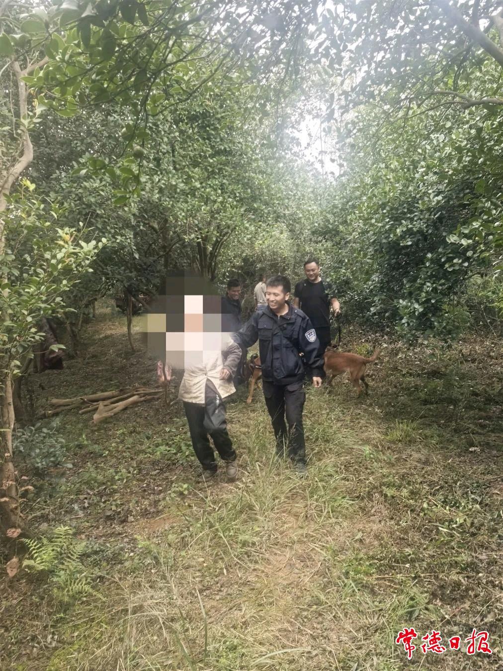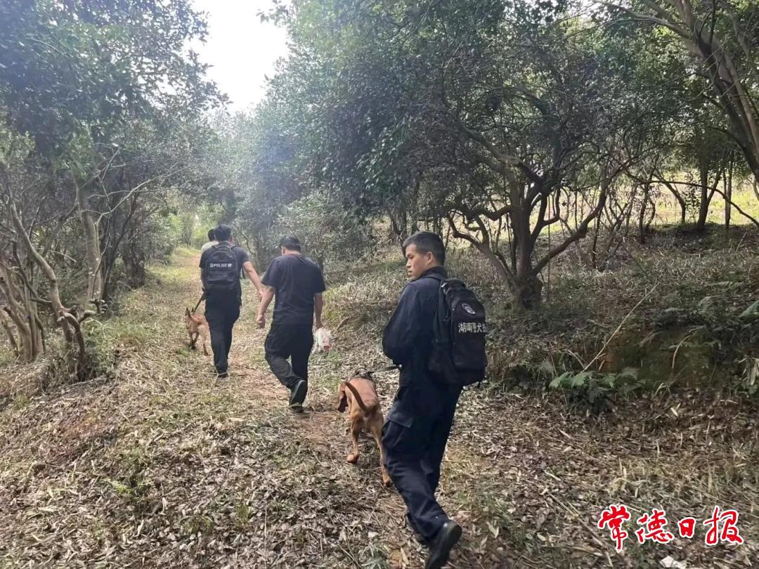 9月18日14时许,鼎城区一名八旬老人从家中出走,家属多方寻找无果,万分焦急之下,于9月19日上午报警,接到派出所协助请求后,常德市公安局刑侦支队警犬大队立即响应,指派民辅警携追踪犬火速赶赴现场。民辅警首先向家属详细了解走失老人的体貌特征及最后可能出现的区域,随后以老人的日常衣物为嗅源,以其最后消失地点为起点展开追踪。警犬“饕餮”和“南海”在训导员指令下迅速进入工作状态,克服山地复杂环境,持续开展搜寻。经过近一小时紧张作业,警犬引导搜救队伍向深山区域持续推进,并在距老人家约两公里处的后山位置做出明确示警。民辅警随即展开细致查找,最终在附近发现倒卧在地的老人。