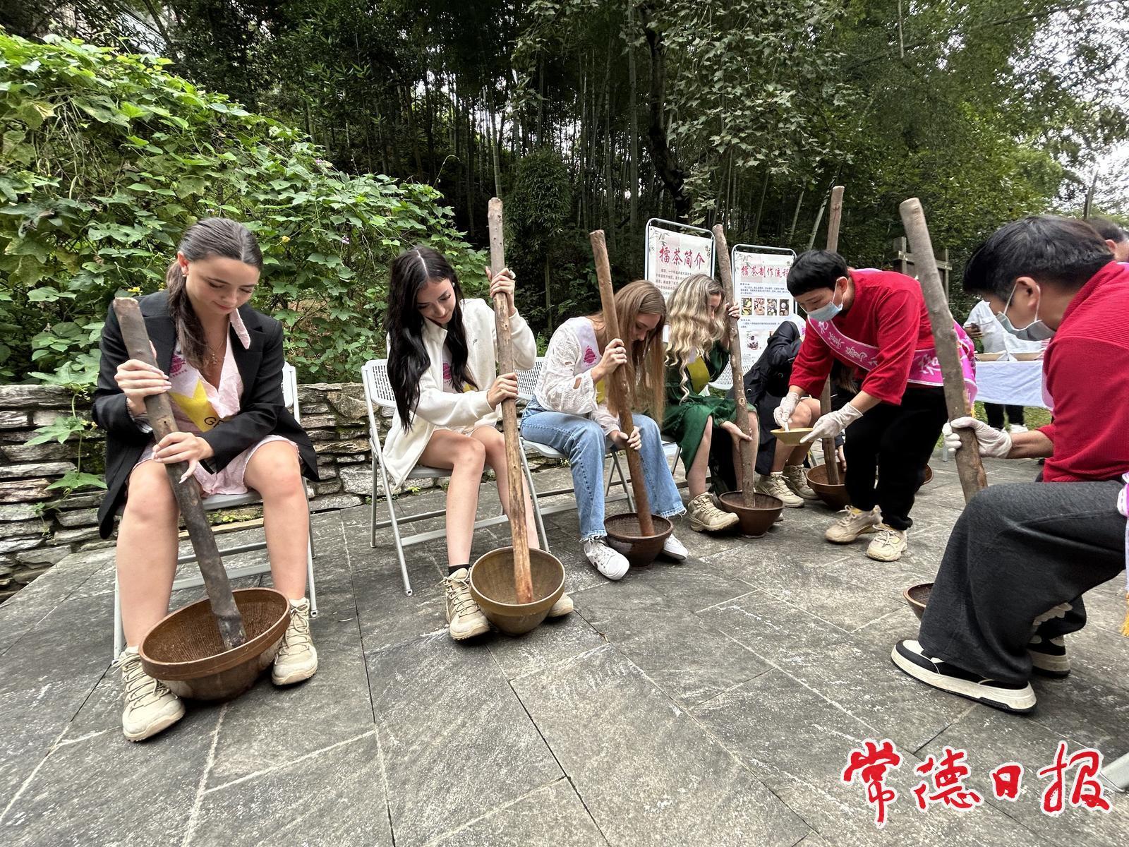 行程的最后一站,佳丽们来到风景旖旎的花岩溪国家森林公园。在潺潺溪水与郁郁林木间,她们亲手体验了有着千年历史的特色擂茶制作工艺,还品尝了地道的擂茶宴。席间,佳丽们纷纷举起茶碗,用微笑传递跨文化的友好情谊,还饶有兴致地学起了常德话:“擂茶,好嚯!”